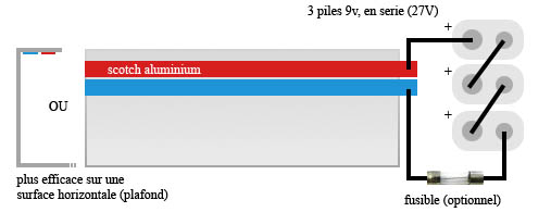 - un fusible de puissance adapté (optionnel) même si ça présence ne change rien quand au fonctionnement de l'anti-évasion électrique il est très conseillé car un court circuit du à une mauvaise installation ou à des fourmis qui auraient détérioré le dispositif produirait l'échauffement des piles ou des files qui peut aller jusqu'à l'explosion et risque d'incendie ou brulure en cas de maniement. De plus qui dit court circuit dit déchargement total des piles en quelques secondes, et donc la nécessité de les changer (cout extrêmement supérieur à un simple fusible ! donc si vous ne le faites pas pour vous , faites le pour votre porte monnaie, il vous le rendra bien