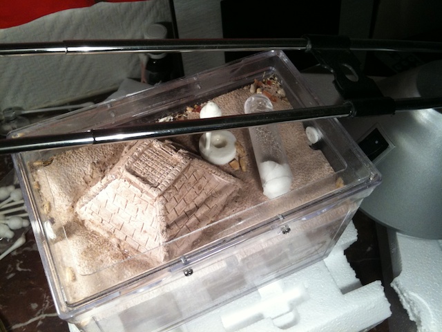 La fourmilière complétement cachée par une serviette pour ne pas les stresser: