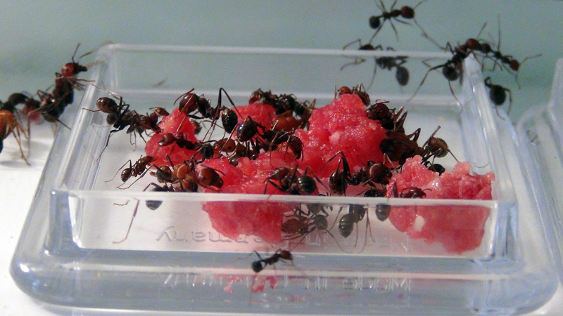 De toutes les colonies dont je m'occupe, dix en l'occurrence et quels que soient leurs effectifs respectifs, c'est assurément celle de mes Messor cephalotes qui me réclame une vigilance de tous les instants. D'aucuns penseraient qu'il suffit de leur jeter quelques graines et de leur laisser à disposition un simple abreuvoir. Il n'en est rien. Hormis le fait qu'elles consomment un nombre considérable de graines chaque semaine en regard de leur nombre, il me faut varier en permanence l'offre car il n'y a pas de règle... Dans le sens qu'elles sont extraordinairement capricieuses. Mes stocks se composent de douze types de graines différentes. Prenons le simple exemple du pissenlit. Ces fourmis l'adorent mais dès l'instant où il est proposé avec d'autres semences pourtant moins appréciées, il est boudé. Un autre cas m'a interpellé : si vous donnez de l'eau sucrée, elles se jetteront sur du simple blé alors qu'elles ne le regarderont même pas avec de l'eau dépourvue de sucre. Les exemples sont si nombreux qu'ils m'obligent continuellement à modifier leur régime alimentaire. Seul leur appétit pour mes dodues Blatta lateralis semble la constante : sept à huit chaque jour. La colonie ne semble d'ailleurs pas avoir de limite à ce propos, des proies qu'elles chassent telles des "énergumènes".