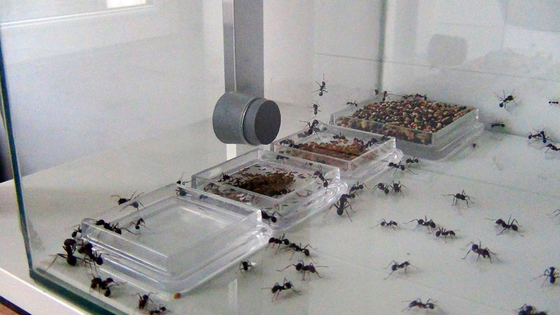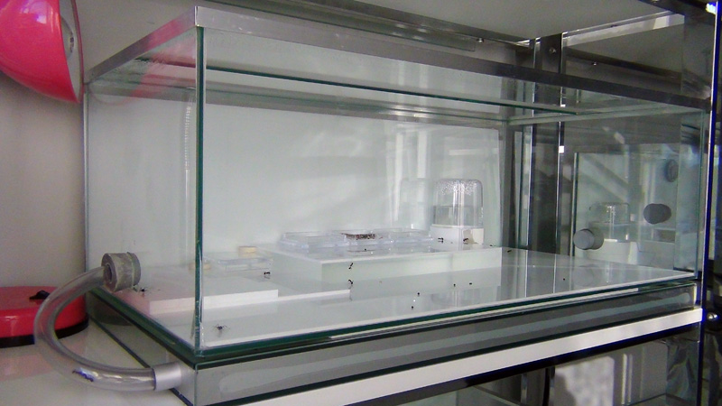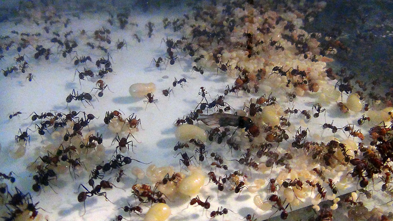 Que dire aussi de cette propension qu'à la reine à sortir de son cocon de verre chaque nuit pour aller boire le coton imbibé que je mets continuellement à leur disposition ou bien encore ces nombreuses ouvrières en furie, qui, à la moindre contrariété se mettent à gravir avec succès les parois de verre de l'aquarium faisant fi de l'anti-évasion appliqué ! Mais à ces comportements déroutants s'ajoute leurs différentes attitudes expertes en regard des graines proposées, graines qu'elles déplacent, trient inlassablement voire simplement rejettent... un temps. Pourquoi... mais pourquoi donc certains de mes major s'évertuent à "jeter à terre" les bouchons de caoutchouc cloisonnant leur nid une fois la semaine pas plus ou bien la nuitée venue je les vois s'enfuir je ne sais où avec une nymphe pour finalement revenir sur leurs pas ? Ces attitudes inhabituelles me passionnent et éveillent en moi curiosité et fascination pour le genre.