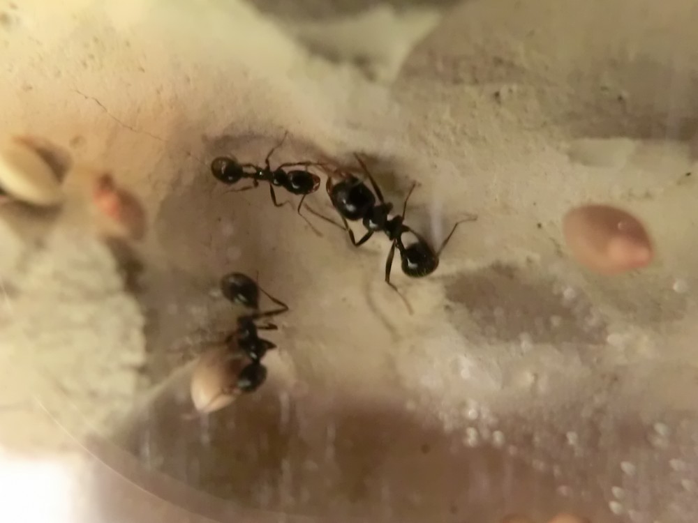 Sachant que nous avons reçu nos fourmis mardi et que nous avions compté 8 ouvrières et la gyne... Bref voici quelques photos. Sur 2 d'entre elles, on peut observer une nymphe