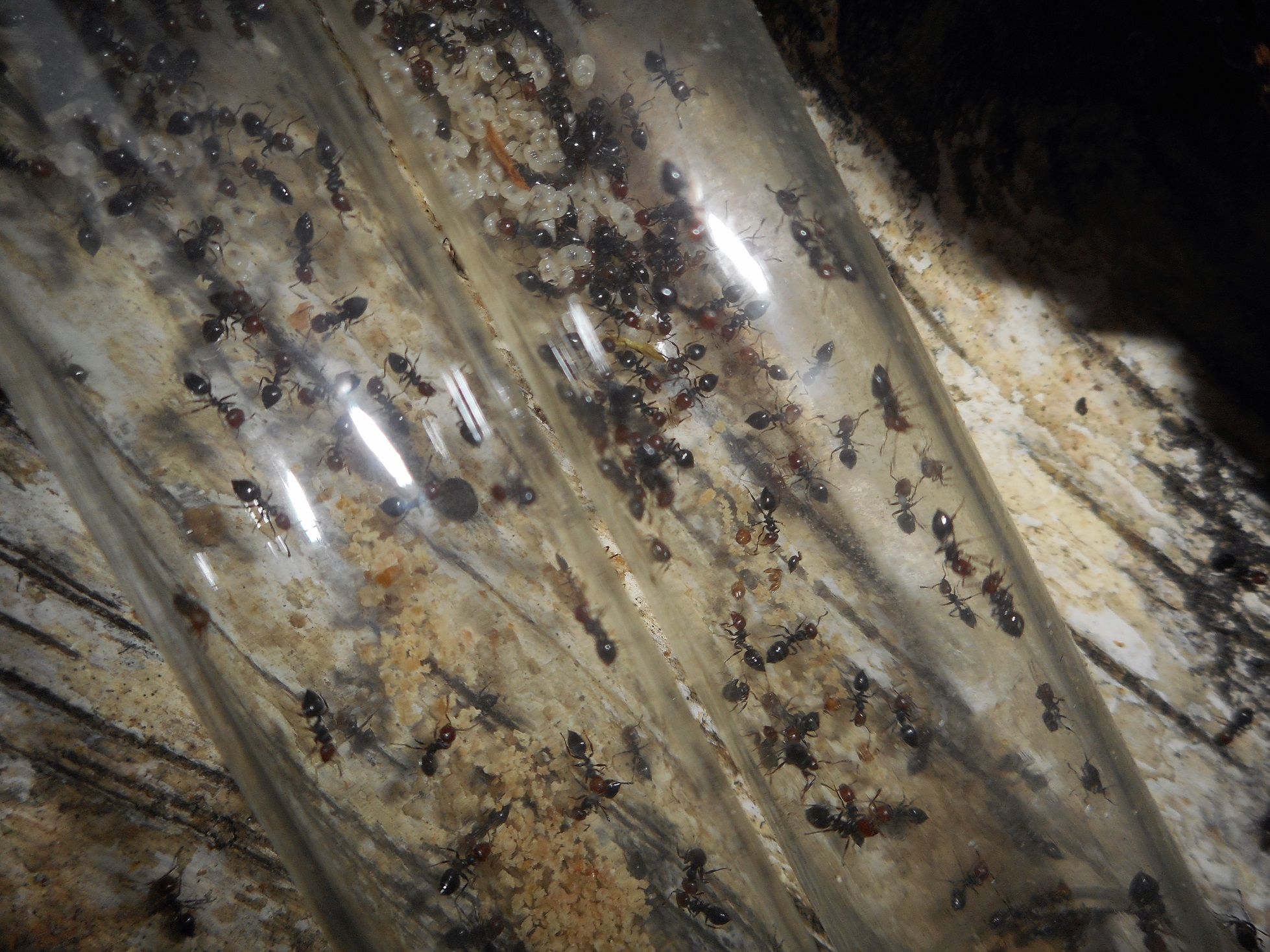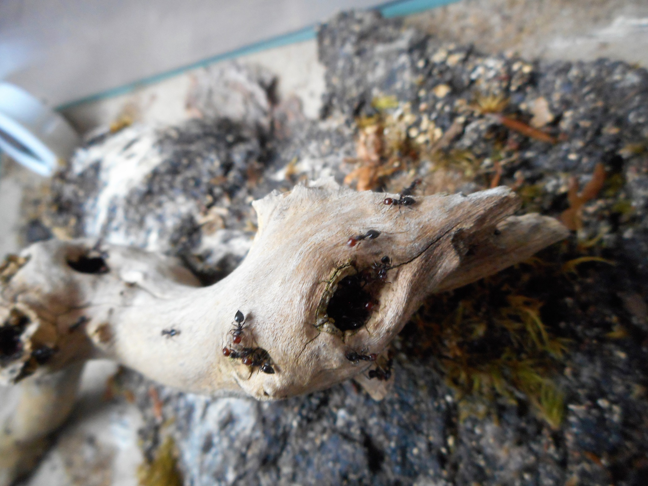 Mon doudou a eu la "bonne idée" de me faire rajouter une branche morte en guise de décors. Gros couac, les fourmis en sont tombées amoureuses, et elles ont surement colonisé tout l'intérieur. ^^ Sinon tout va à merveille, un tiers des tubes (20x200mm) est rempli de couvain, la gyne est introuvable et elles sont organisées pour la déchetterie. ^^