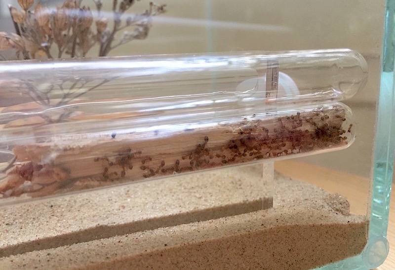 Les fourmis sont bien arrivées dans leur petit tube crasseux, il y a quelques jours maintenant.