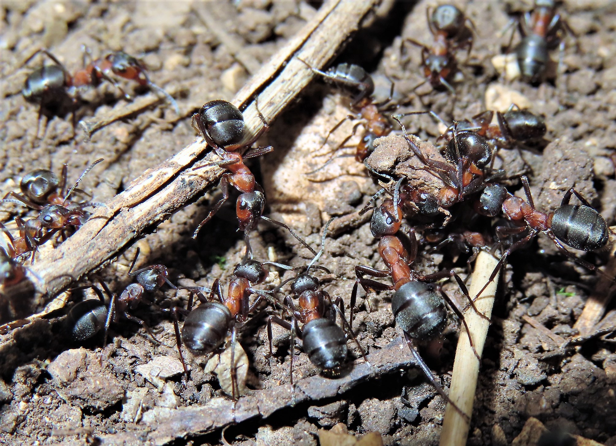 Il n'y a pas d'infirmières chez les fourmis rousses, bien sûr, mais si celles-ci s'attroupent ainsi c'est parce que j'ai marché sur l'une de leurs frangines qui a aussitôt émis des phéromones de détresse. De tels attroupements j'évite au maximum d'en provoquer derrière moi.