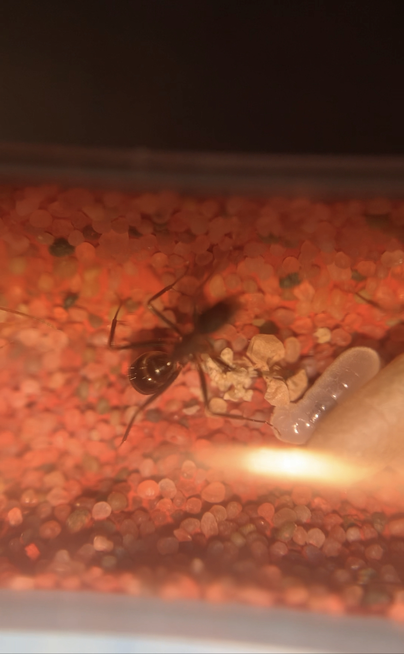 Ce comportement est très intéressant je trouve. On a l’impression que c’est la reine maintenant qui protège les cocons et non les ouvrières .. Et elle stresse curieusement aussi beaucoup moins de la lumière alors qu'en général elle fonce sous l'allu ...