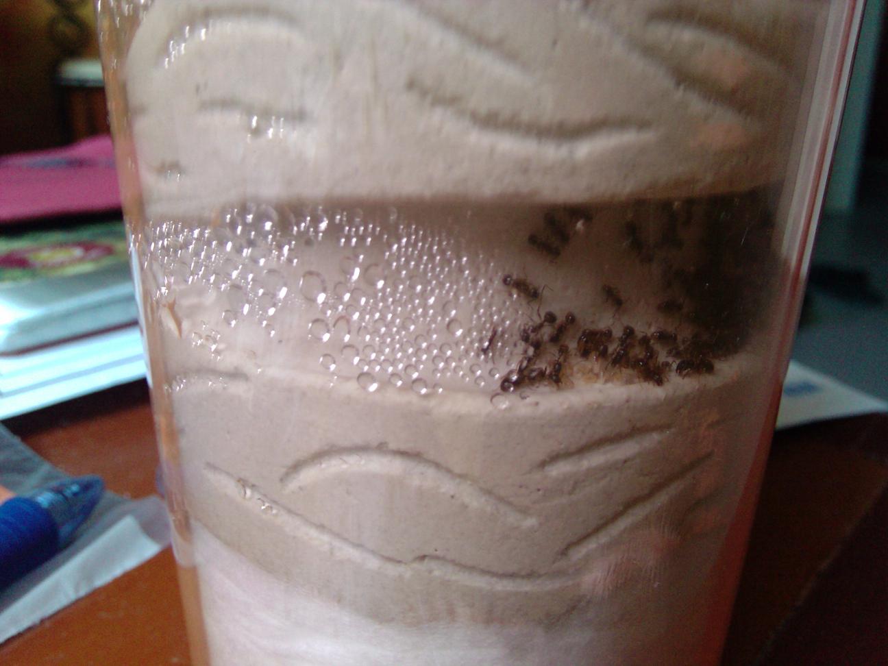 Je viens de faire un tour dans ma chambre pour observer ma colonie : déménagement de l'ensemble de la colonie gyne, ouvrières et couvain vers la partie la plus humide de mon nid (c'est le même nid que j'ai fait dans un verre...) là où il y a le plus de buée de la paroi ! (chouette c'est bon pour l'observation -_-' )
