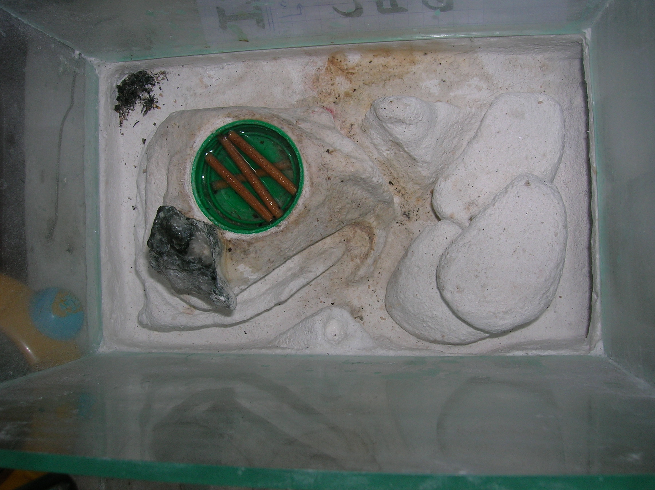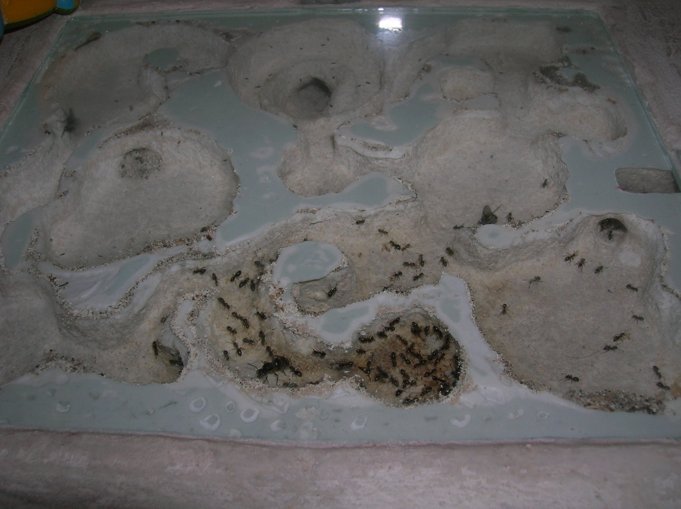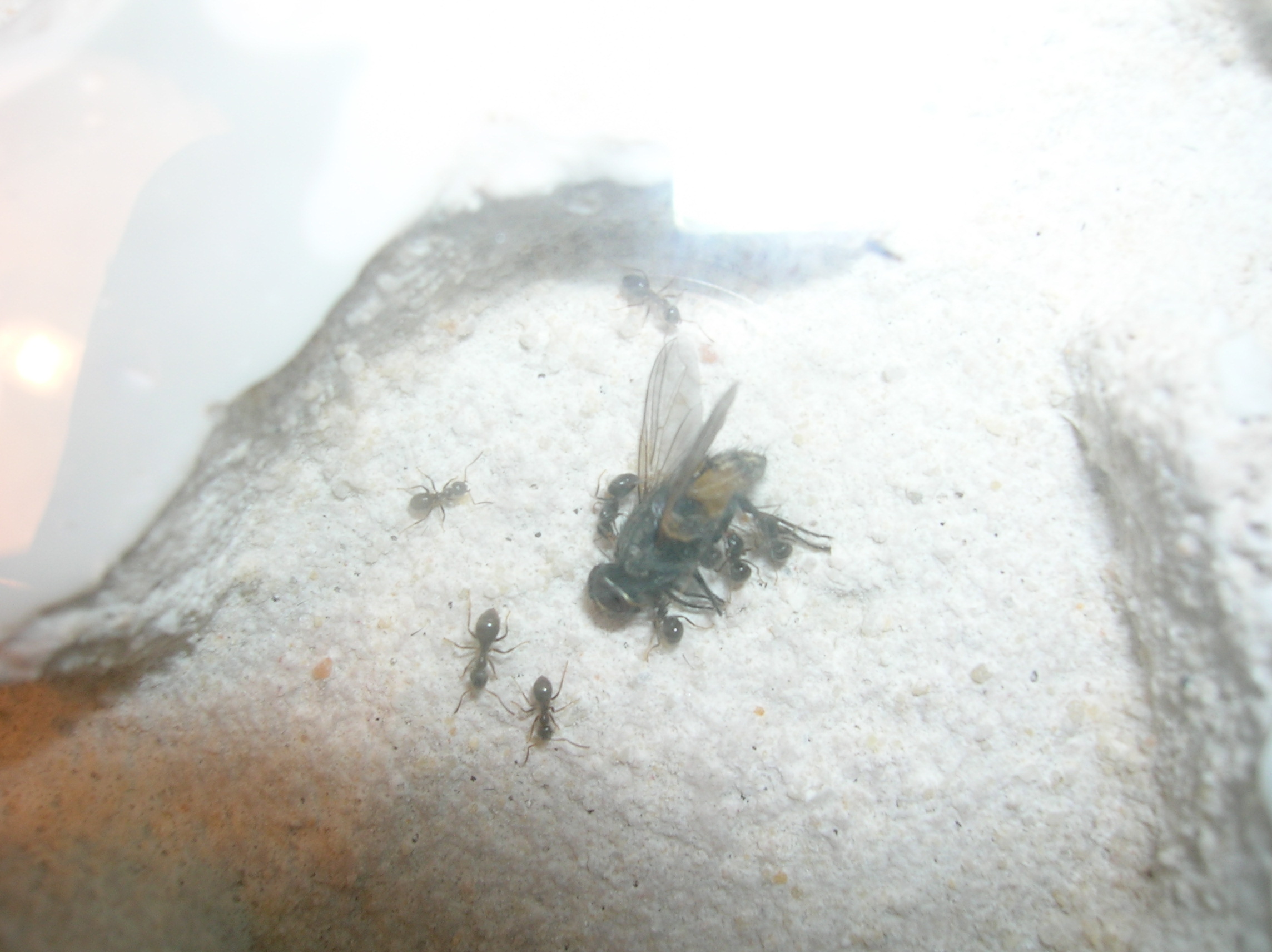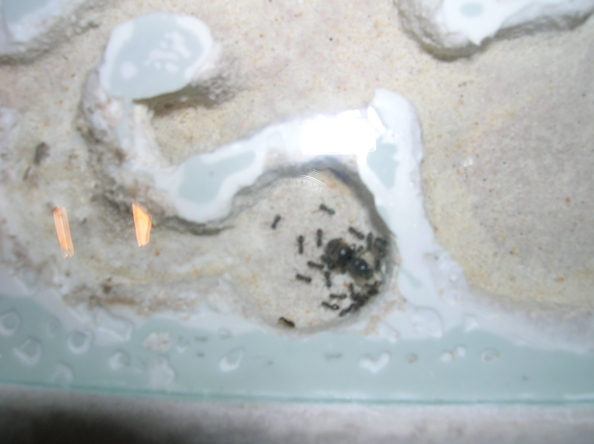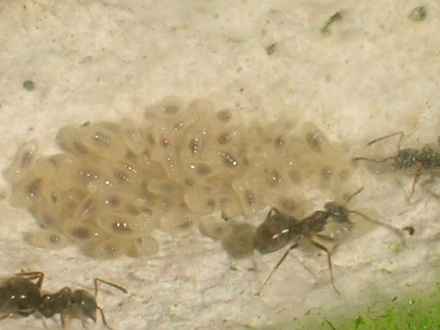 Sur les conseils de Nebula et de Josh34, je vais adjoindre quelques gouttes de vinaigre à l'avenir ; ça ne supprimera peut-être pas ce qu'il y a, mais j'espère que ça ralentira le processus. En tout cas, les fourmis ne semblent pas gênées : Intiya la gyne continue de pondre et ses ouvrières pouponnent.