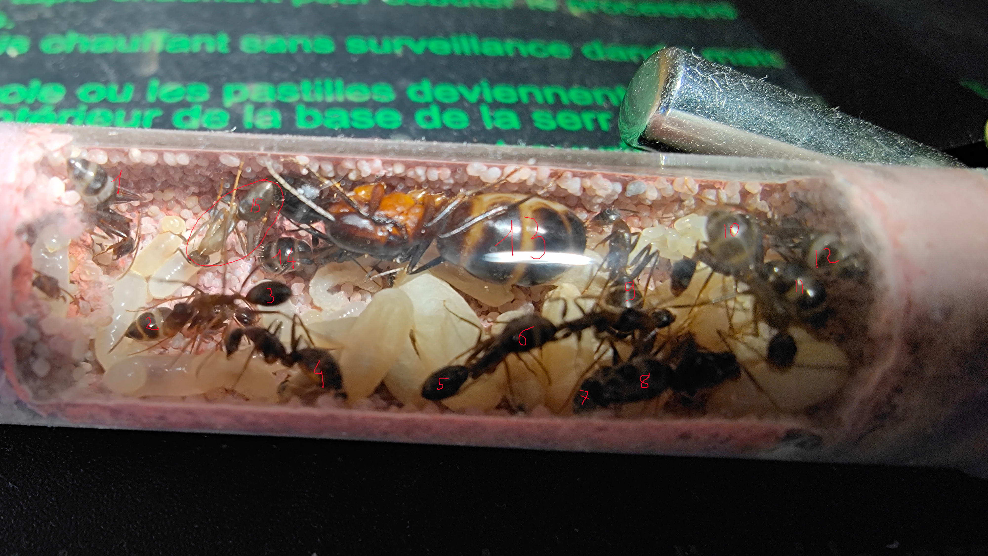 Pour m'y retrouver vu leur nombre, j'ai numéroté les fourmis que je distingue sur la photo, et il me semble que la n°15 est une naissance ? Vu sa couleur, qu'en pensez-vous ? (Il faut afficher l'image en plein écran pour bien distinguer les numéros et leur nombre)