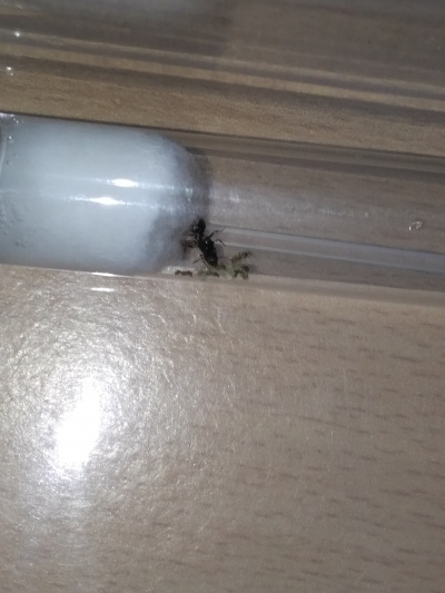 Ah oui en déplaçant toutes mes gynes d'un bureau à une étagère spécialement réservée à ma passion, le tube a roulé.... Grosse panique pour moi et surtout pour elles mais tout est rentré dans l'ordre ! Par ailleurs cette gyne est la "gyne 1", elle remplace l'autre non fécondée, mais dans le bilan je l’appellerai toujours Tetramorium sp. juste un repère pour moi. ;-)