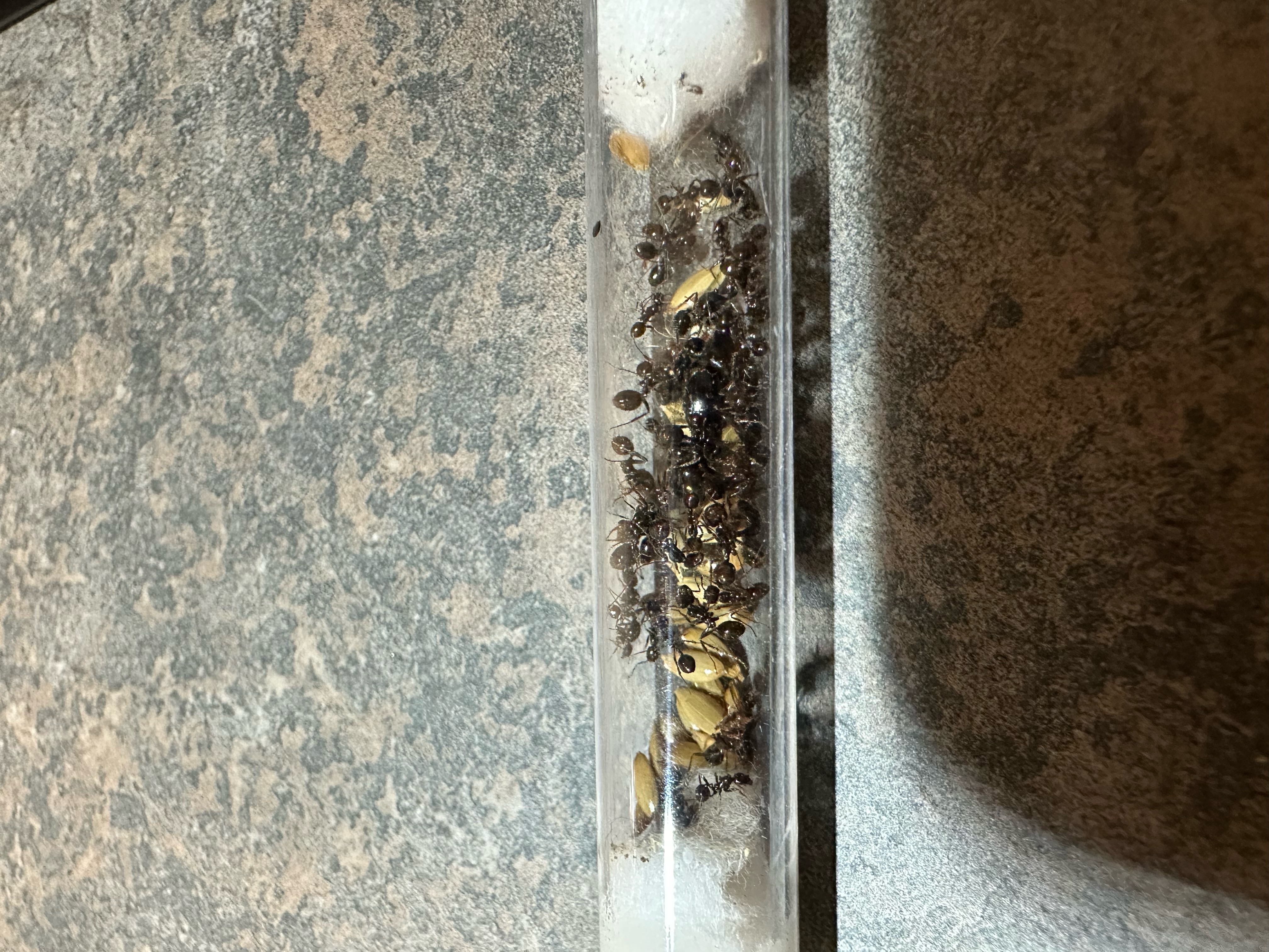Aujourd'hui j'ai reçu la deuxième colonie de Messor structor je vous mets des photos elle est magnifique. Cependant j'ai un petit doute elle ressemble vraiment à Messor barbarus contrairement à la colonie pleine d'acarien qui devrait pourtant plus lui ressembler...