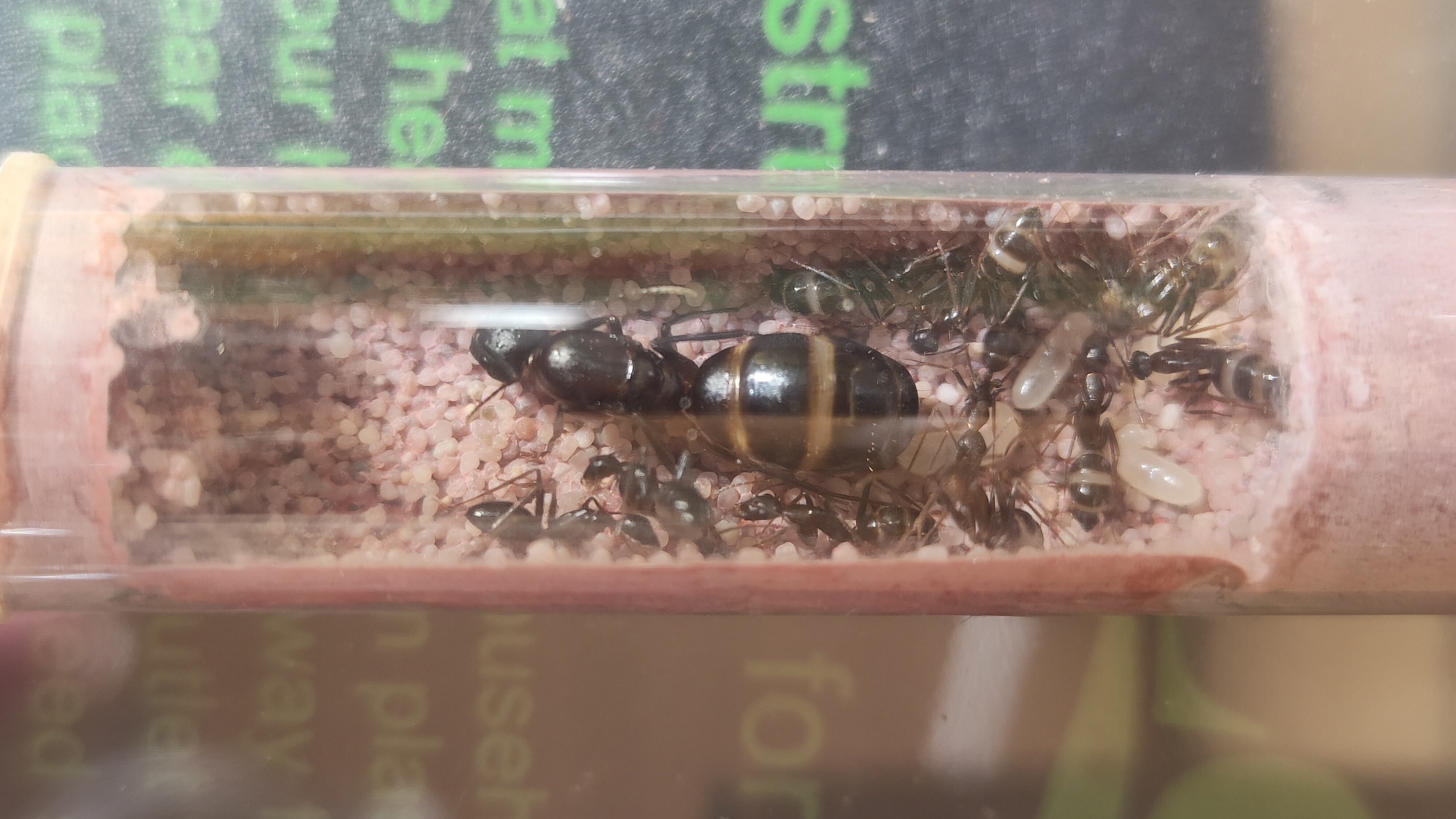 La fondation a bien proliféré, ça fait plaisir à voir. J'ai surtout eu la surprise de découvrir une fourmi immense (pour une espèce aussi grande, on voit vraiment bien la différence). Elle est presque aussi grande que la gyne.