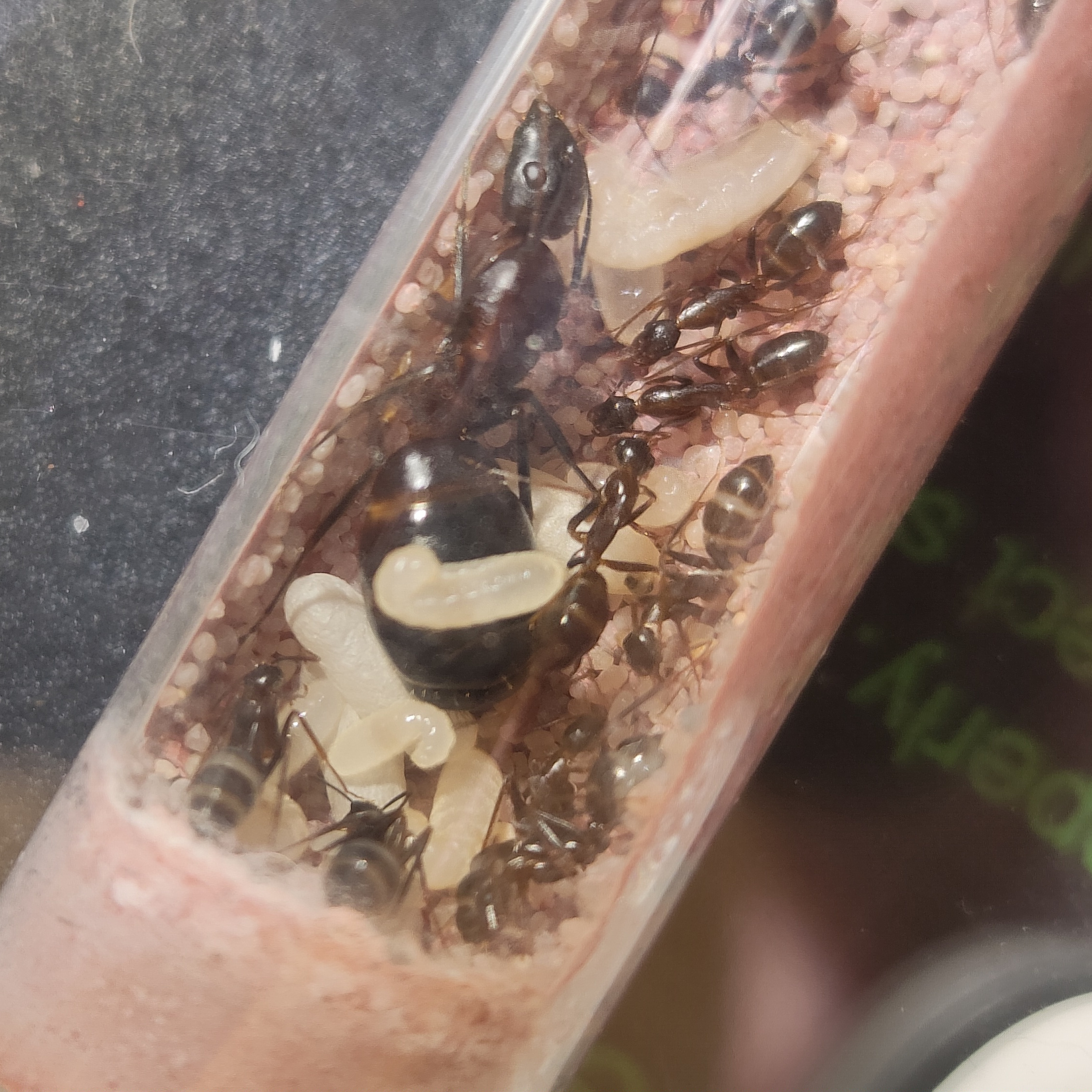 J'ai eu le privilège de voir le déménagement de la gyne, du coup, je sais qu'elle a déménagé avant la totalité de son couvain. Elles sortaient un par un les cocons du tube pour les mettre dans le tuyau de raccord du nouveau nid, mais elles n'aiment pas les vibrations sur leur tube, du coup, quelques tapotements sur le tube (à l'opposé du nouveau nid), et les dernières fourmis sont sorties avec l'aide de leurs congénères.