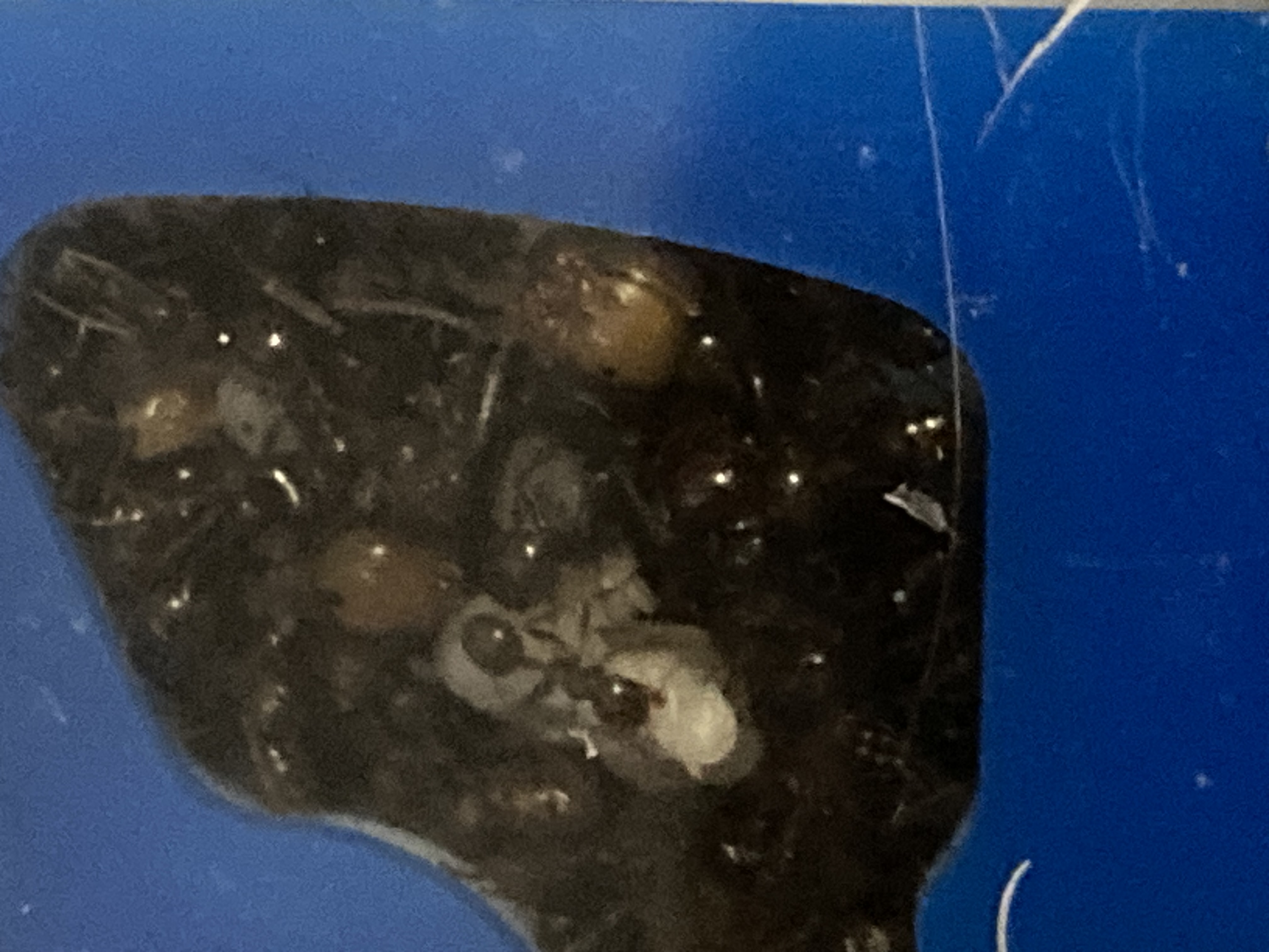 D’abord, j’ai pu constater une vague de mortes ces derniers temps… je crois que je peux presque l’associer au stress un peu plus présent ces derniers temps. Mais pas de quoi diminuer la croissance, le couvain commence à toucher le plafond et prend une très grosse place dans la loge principale avec de nouvelles naissances très souvent ! Dont de nombreux médias