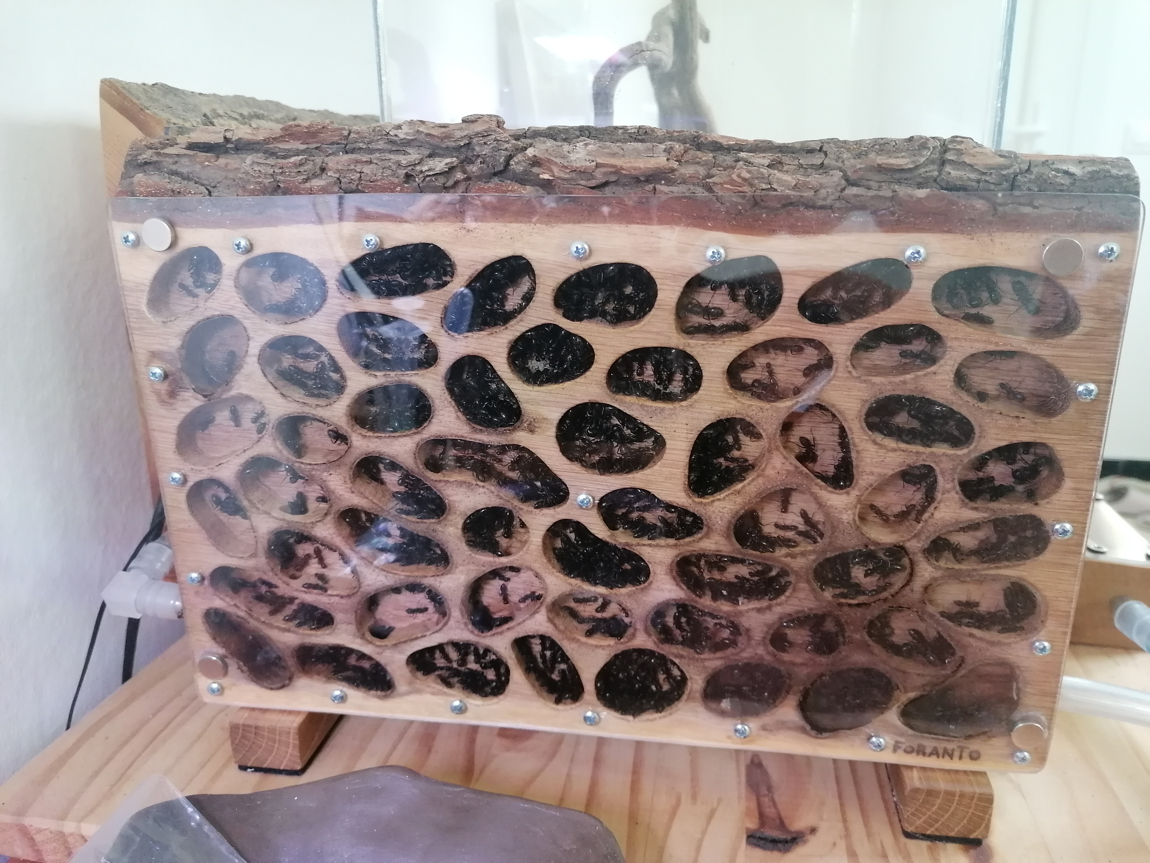 Quelques minutes plus tard avant de partir, mes grosses charpentières étaient déjà en train d'explorer le grand dehors... J'ai regardé cela avec un petit pincement au cœur mélangé avec un peu de soulagement, car maintenir une telle colonie me demandait beaucoup de temps. De plus dans ce blog j'ai volontairement passé certains détails sous silence, notamment de petites évasions dû à leur grande capacité à creuser le bois des nids.