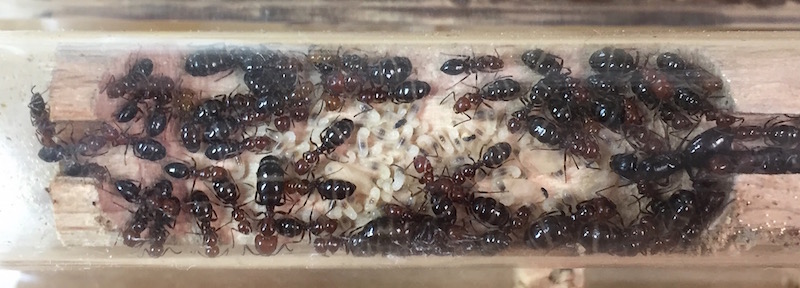 La gyne, quelques dévouées ouvrières, et le couvain sont toujours regroupés près de la mousse humide du tube.