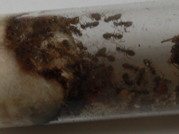Comme je me suis occupé de la colonie 1 cet aprem, ça m'a donné l'idée d'aller récupérer le tube vide, histoire de n'avoir qu'une séance de nettoyage à faire. Je vais dans le jardin, je prends le tube, et... la gyne, ses quelques ouvrières, et le couvain. Ok. Bon bah retour à la maison, je n'ai pas le coeur à les laisser mourir dehors ainsi dans un tube tout sec, elles ne survivraient pas, juste protégées ainsi par leur tube en verre.