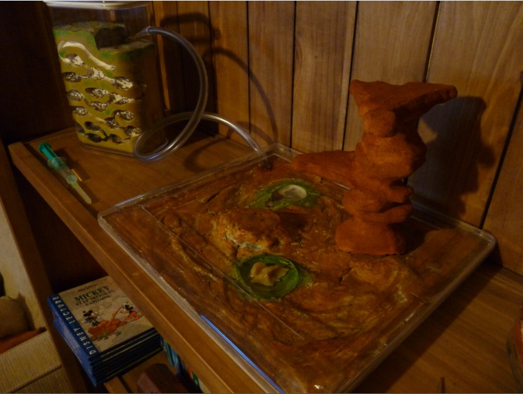 Thuthur, les deux ronds dans le sol sont des empreintes, une pour un verre de montre pour y mettre la nourriture liquide et que je puisse nettoyer facilement, et l'autre est l'emprunte d'un abreuvoir pour ne pas qu'il tombe comme le sol est irrégulier.