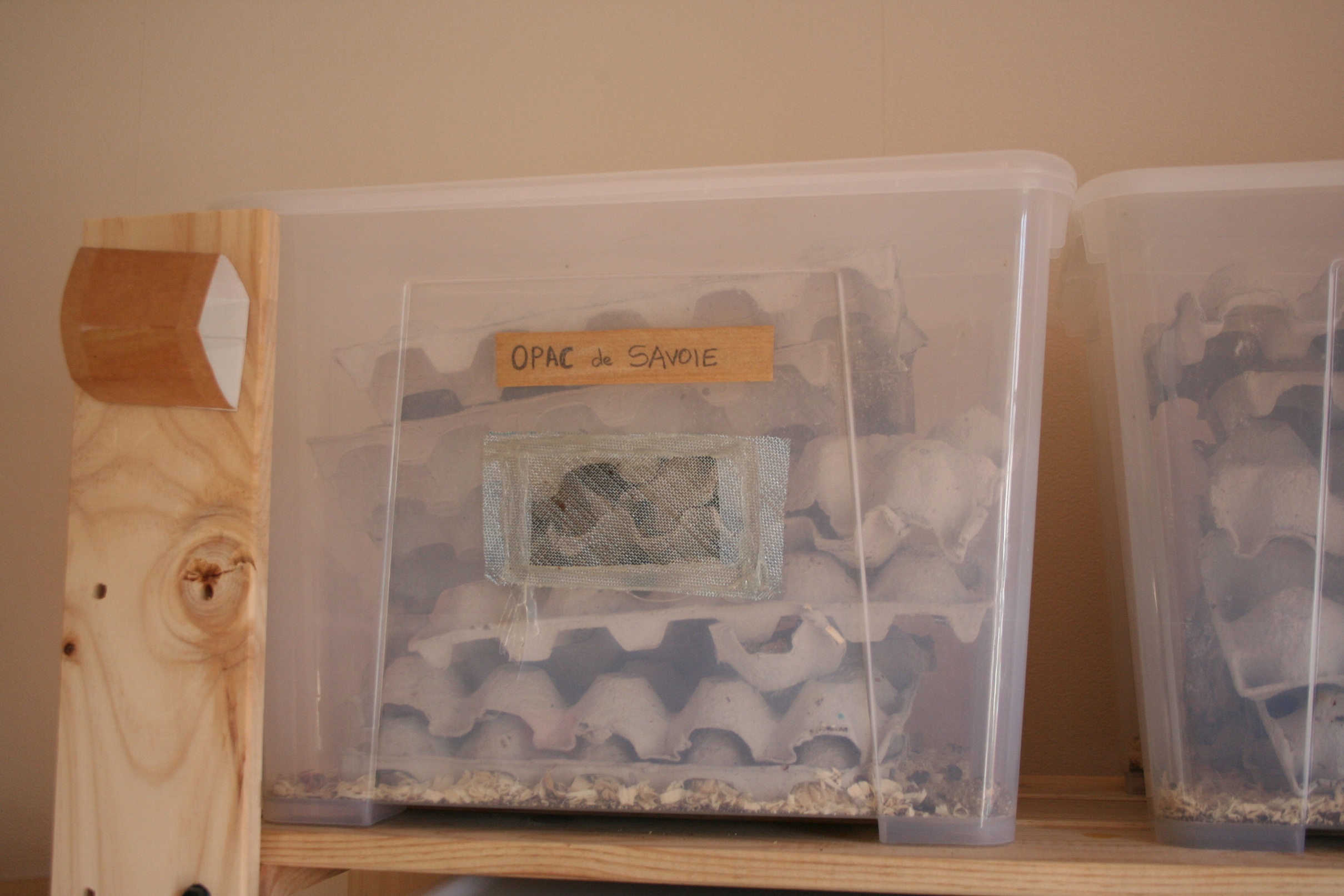 Toute cachette est la bienvenue, carton à œufs, rouleaux vides de sopalin écrasées entre eux, papier froissé, morceaux d'écorce.