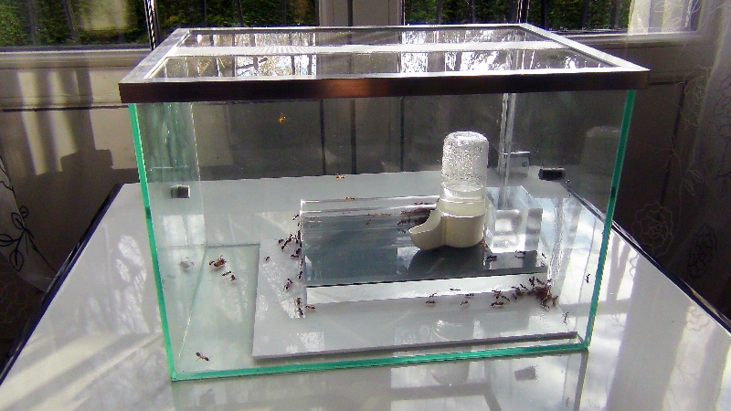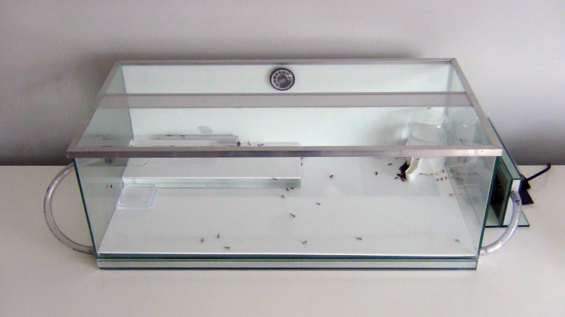 Camponotus festinatus qui est, pour rappel, composé d'un bac en verre mesurant 25x20x20cm muni d'un couvercle dans lequel je dispose deux tubes à essai à même une plaque de plexiglas blanche ainsi qu'un abreuvoir d'eau sucrée. Un habitacle sobre, efficace et hermétiquement clos.