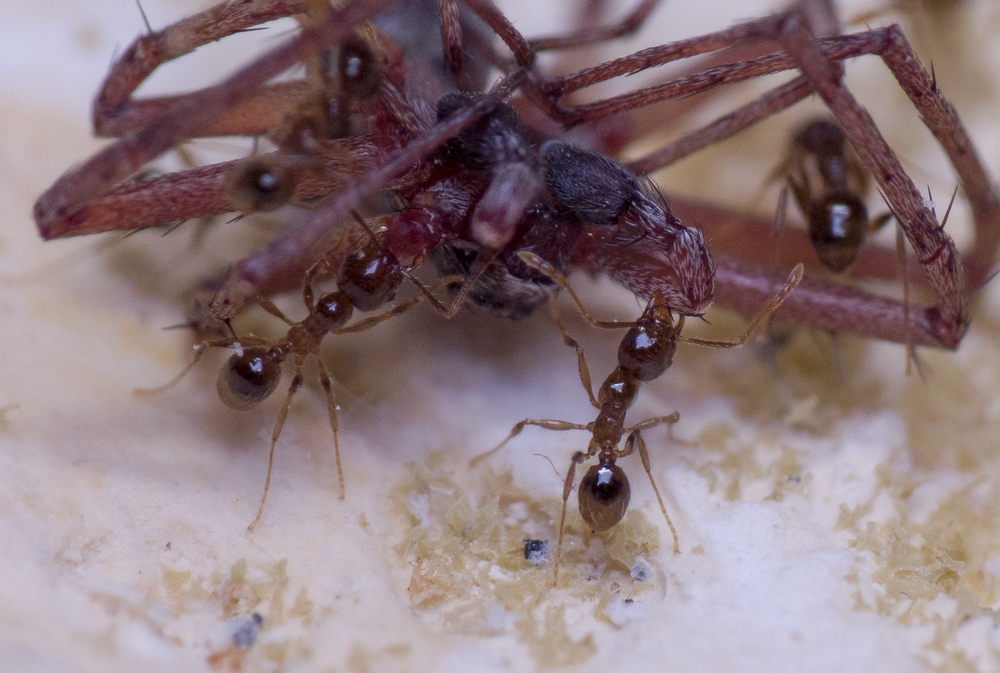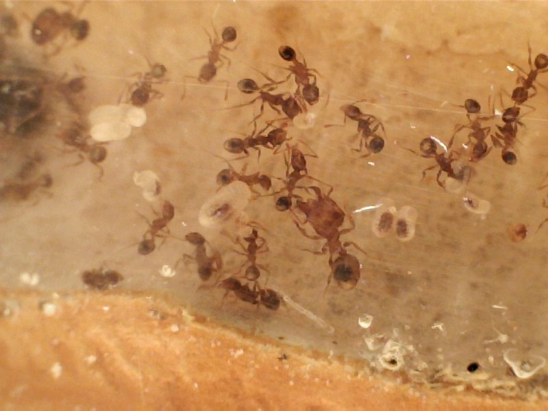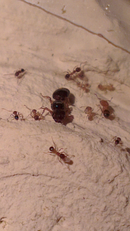 Pendant ce temps là, les ouvrières explorent l'aire de chasse, et cet après midi, elles ont trouvé une miette de brioche qu'elles tentent de ramener dans leur nid. A plusieurs et avec l'aide d'un soldat, elles finiront par la faire entrer dans le tube.