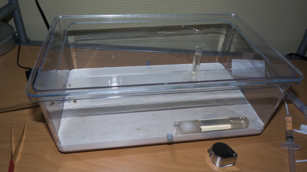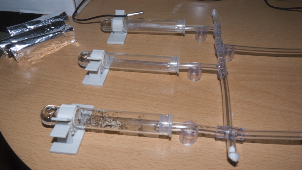 Il ne lui a pas fallu longtemps pour trouver l'entrée du nid, et depuis elle est restée dans le nid juste devant le tube reliant celui-ci à l'ADC. J'essaye de chauffer légèrement l'autre côté du "building" pour qu'elle s'y installe et que son observation soit facilitée. Pour l'instant je n'observe pas de résultat probant, mais je vais lui laisser le temps de choisir son endroit.