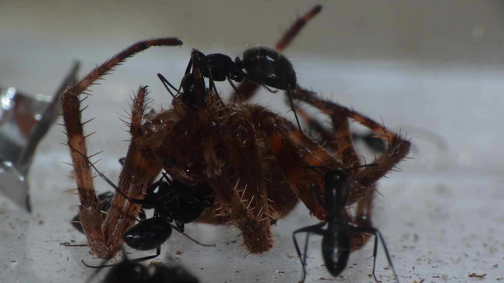 Les petits insectes ont toujours la côte, mais les grosses mouches ou araignées ne sont pas (plus) rejetées désormais et sont attaqués sans aucune hésitation, alors que j'avais cru comprendre que les Camponotus étaient des charognardes.