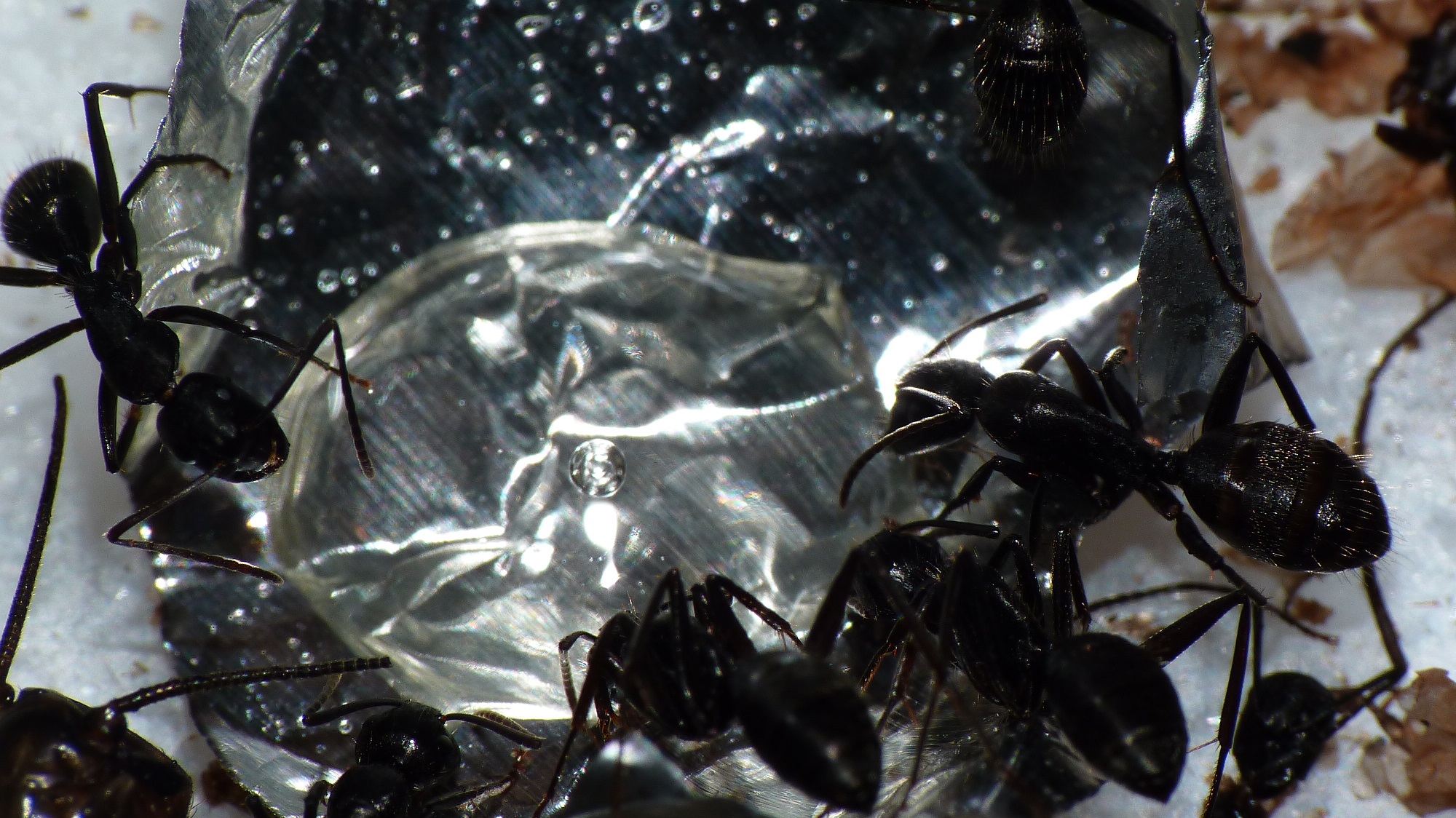 J'ai remarqué que le miel d'acacia (bio) déclenchait de super physogastries, bien plus que tous les autres miellats que j'ai essayé avec elles. 3 ou 4 ouvrières, toujours les mêmes, font des allers retours entre le miellat et la colonie, afin de partager le précieux liquide avec les larves, les autres ouvrières et la reine. Une fois que tout le monde est servi, le miellat restant est recouvert intégralement avec des déchets. Elles font aussi des triphallaxies (trophallaxie à trois) ! *vicieux*