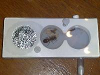 Transfert du tube dans un module de fondation de fabrication perso. Ce module fait 10,5cm de long sur 4,5cm de large et est composé de 3 galeries de 2,5cm de diamètre. La première galerie étant isolée des autres sert de réserve d’eau. L’eau en s’évaporant se condense sur la paroi en plexi et se diffuse par capillarité, augmentant l’hygrométrie des autres galeries et permettant aux fourmis de capter l’humidité dans l’air par des stigmates hydrostatiques (en théorie).
