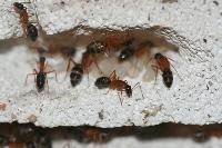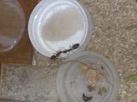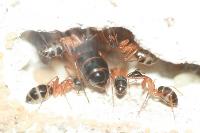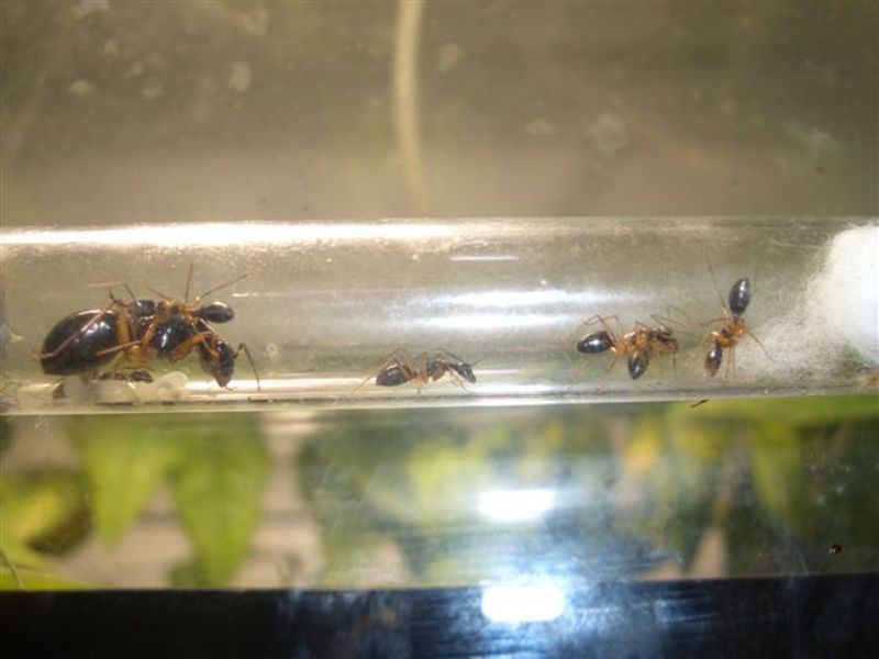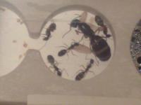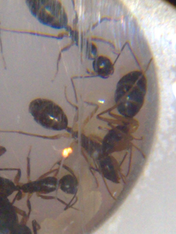 Viande hachée en tube s’il vous plait. Je ne sais pas si elles y ont touché ? Les autres fourmis en mangent généralement. Je ne les ai pas vu mangé car il faut dire que ces fourmis auraient des meurs plutôt nocturnes, ce qui est le souvent le cas des grosses espèces comme les Camponotus giga qui ne sortent que la nuit pour éviter certains prédateurs diurnes. Ca m’arrive assez souvent de surprendre une ouvrière la nuit dans l’ADC, mais des qu’elle voit de la lumière, elle ne reste pas longtemps et rentre dans le nid.