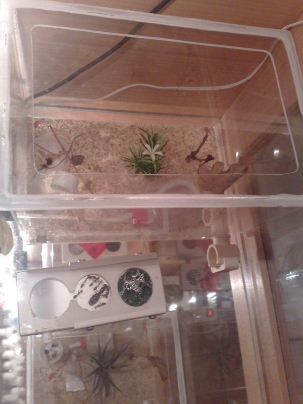 Pas beaucoup d’activité le deuxième jour. Elles sont placées à 21°C. J’ai l’intention de les placer à des températures plus élevées, mais pour le moment je les acclimate progressivement car elles sont restées plusieurs jours à des températures plus froides et je ne veux pas provoquer de choc thermique. Maximus m’a fait un peu peur car elle prend une drôle de posture, la tête en bas, et un moment j’ai cru qu’elle était morte. J’ai relié le tube avec une ADC de ma confection. J’ai disposé dans l’ADC une petite capsule avec un morceau de P40, un gros granulé et quelques micros granulés. Une autre capsule avec un coton imbibé de liquide sucrée que deux ouvrières se sont fait une joie de venir siroter.