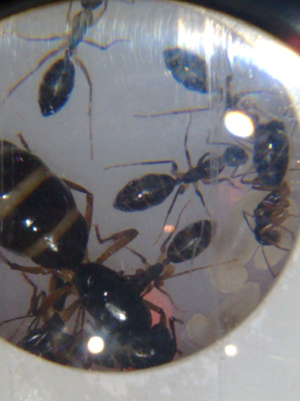 Maximus, la gyne, qui fait bien ses 2cm passé, est non seulement plus grande que Lucius Borenus (ma gyne ligniperdus), mais plus grosse aussi en corpulence. Elle est accompagné de 6 ouvrières et seulement 3 larves dont une plus petite. Ces minors, qui sont des minimes (1ère génération) font déjà 1cm voir plus. J’ai hâte de voir les majors (mais bon, j’ai le temps !). En attendant, elles sont magnifiques avec leurs pattes jaunes et le reste du corps entièrement noir.