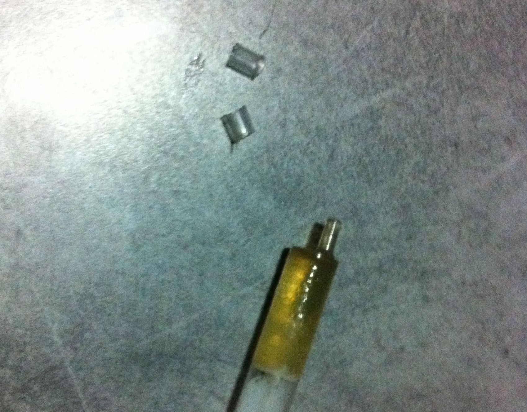 1) Prendre une seringue d'eau sucrée ou de pseudo miellat + un petit tube plexi de diamètre 0,3 mm ou 0,4 mm. Le couper à 0,5 mm de long. Il faut qu'il soit légèrement plus grand que la tête de la seringue.