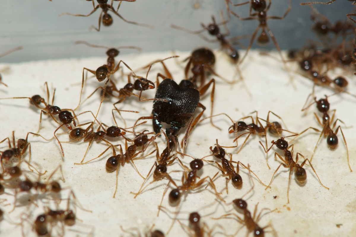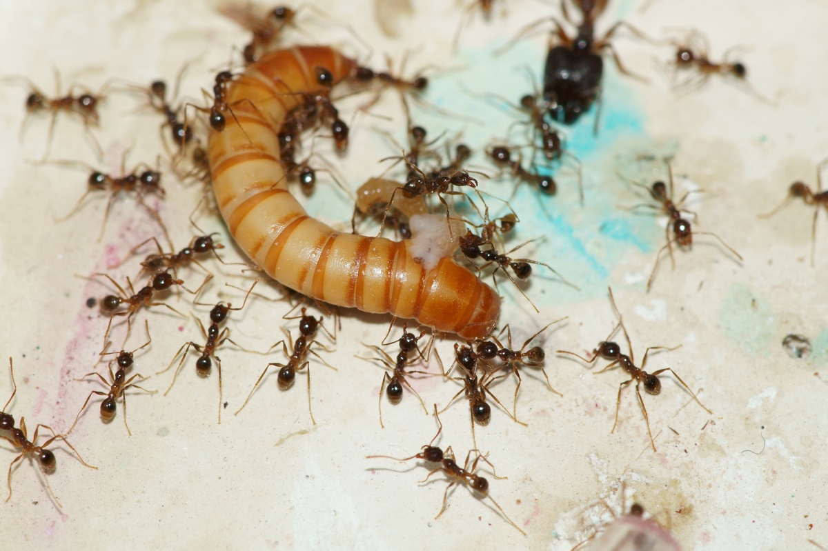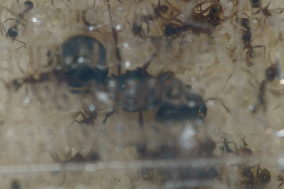 En parlant de nourriture, ces fourmis sont très voraces et agressives. Je leur donne tout les jours un ou deux vers de farines, grillons, ou blattes (congelées), qu'elles s'empressent de découper et de ramener dans le nid. Tout y passe tant que cela bouge ou que c'est comestible.