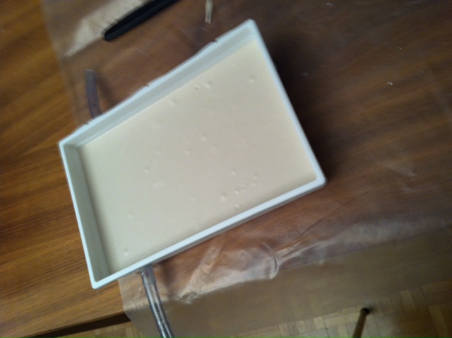 Voilà, avant de couler, assurez-vous que votre coffrage (la boite en plastique) soit sur une surface bien plane.