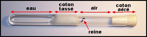 4- Quand les Lasius niger sont calmées, glisser une toute petite boule de coton imbibée d'un miellat (tu fais un simple mélange eau-sucre pas trop sucré), le coton doit être à peine humide et non pas dégouliner de partout. Tu le poses au tout début du tube des Lasius.