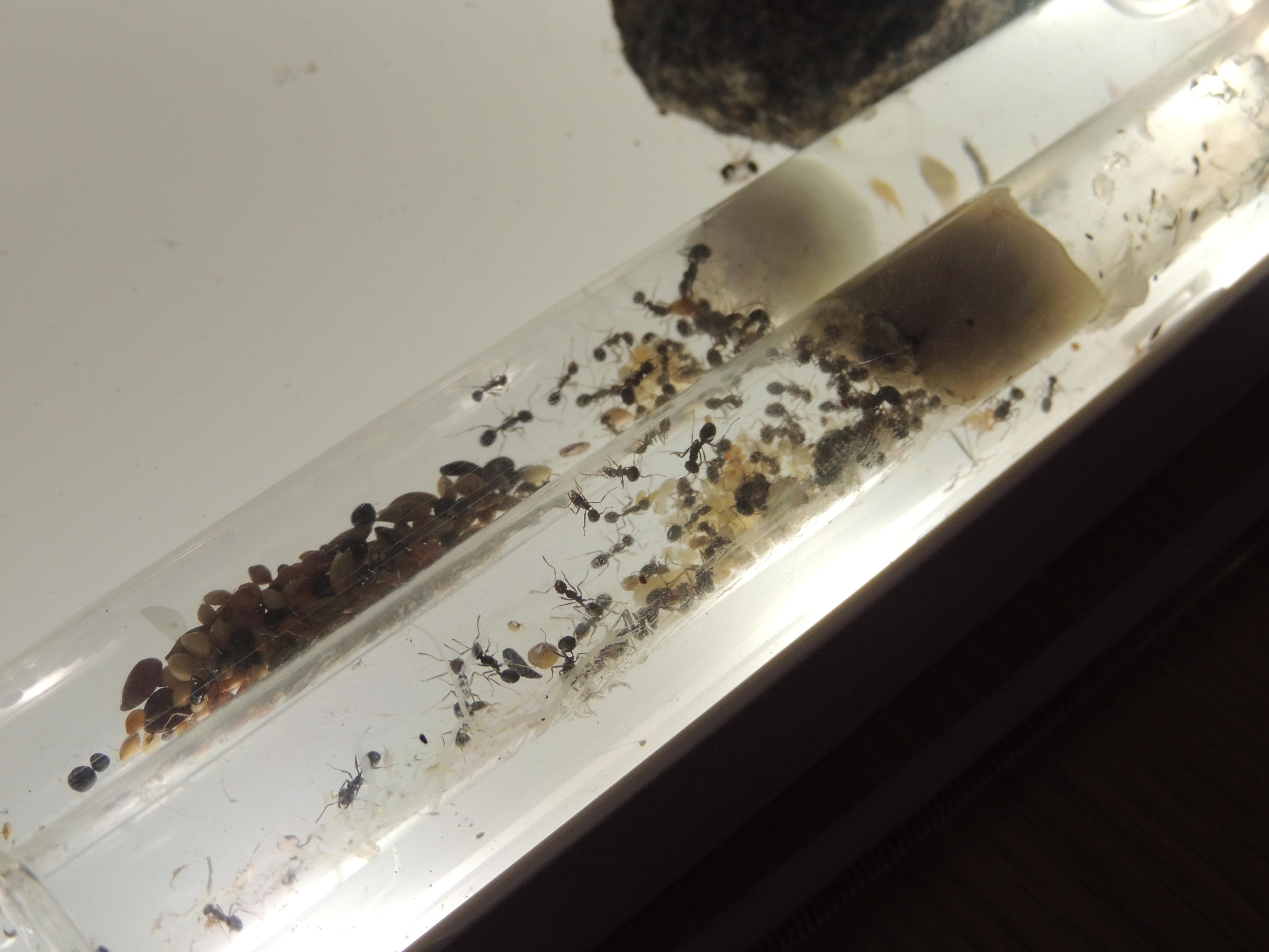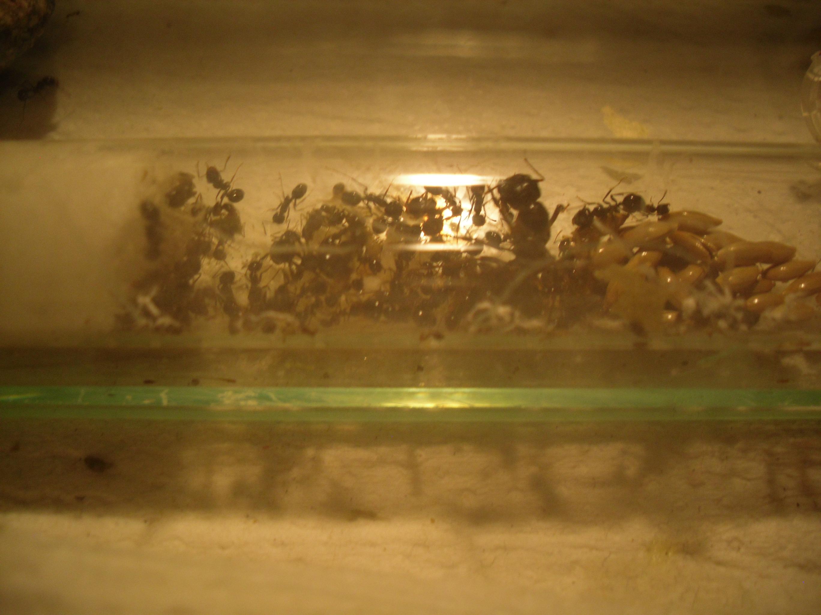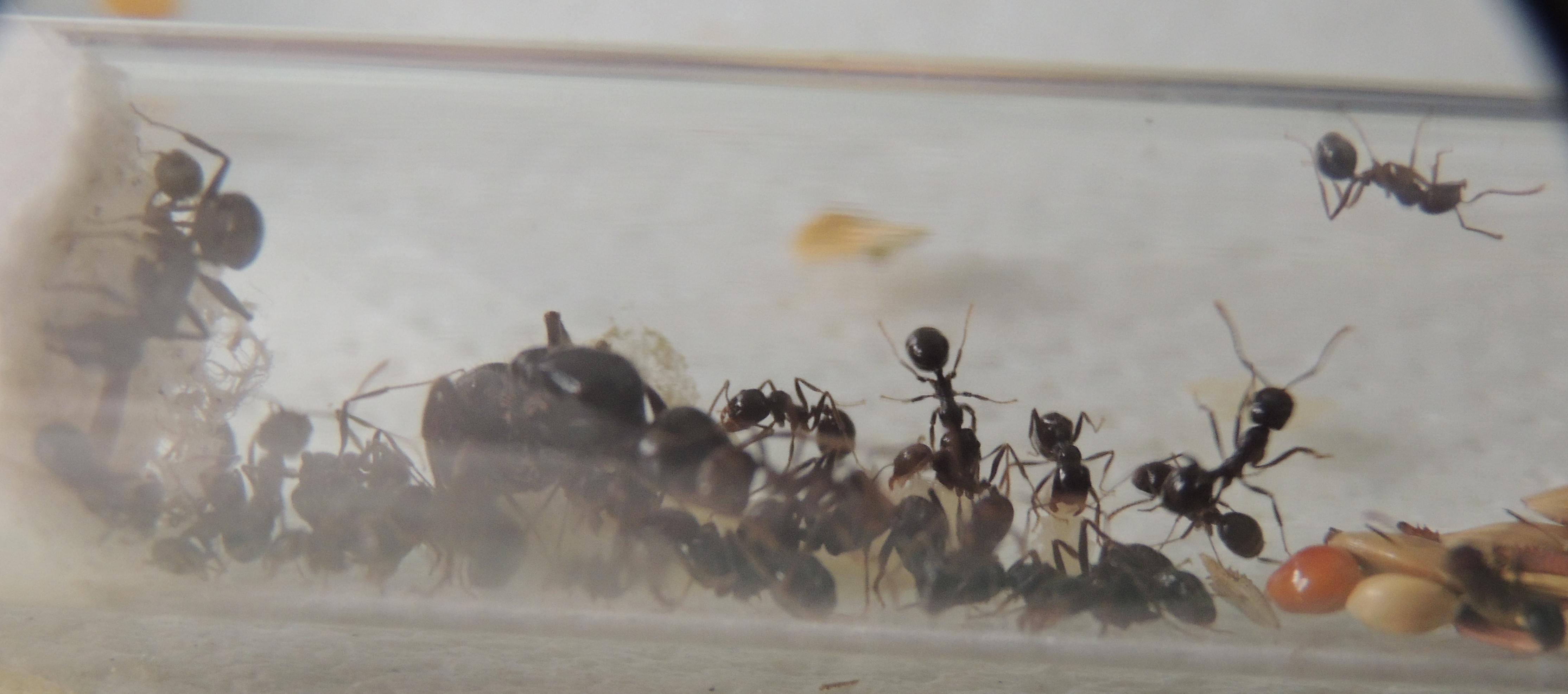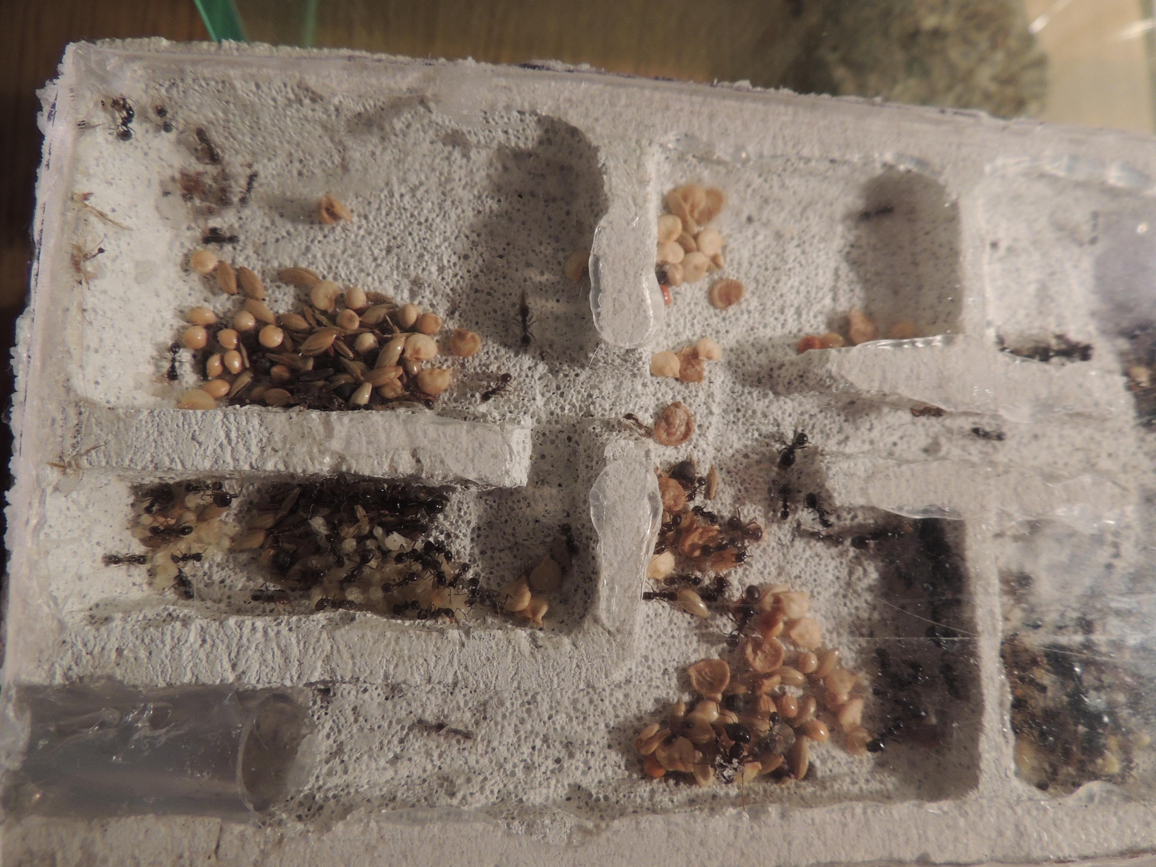 Pour la petite histoire, il faut savoir que le genre Messor est parfois moins fragile qu'il n'y parait. Oh nombre de fois que je m'y suis essayé avec M. barbarus (3 fois, pour être exact) : acariens, température, hygrométrie, tout s'est ligué pour ne jamais les faire survivre hors d'un tube à essais. A dire vrai, je n'ai jamais été fichu de fournir un nid viable à des Messor (étrange me direz vous ? J'en conviens). Cette fondation s’avérait donc être pour moi une avancée significative.