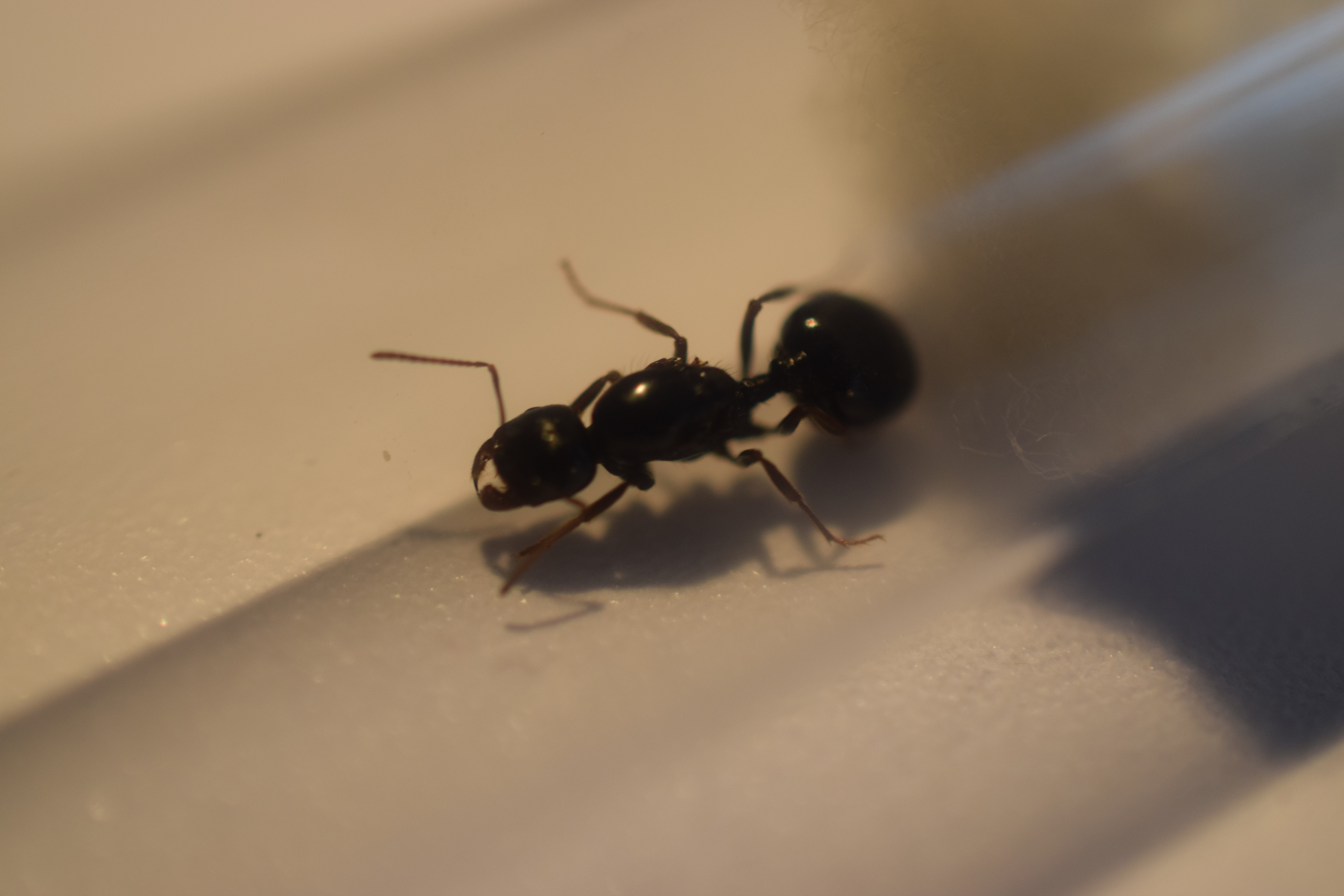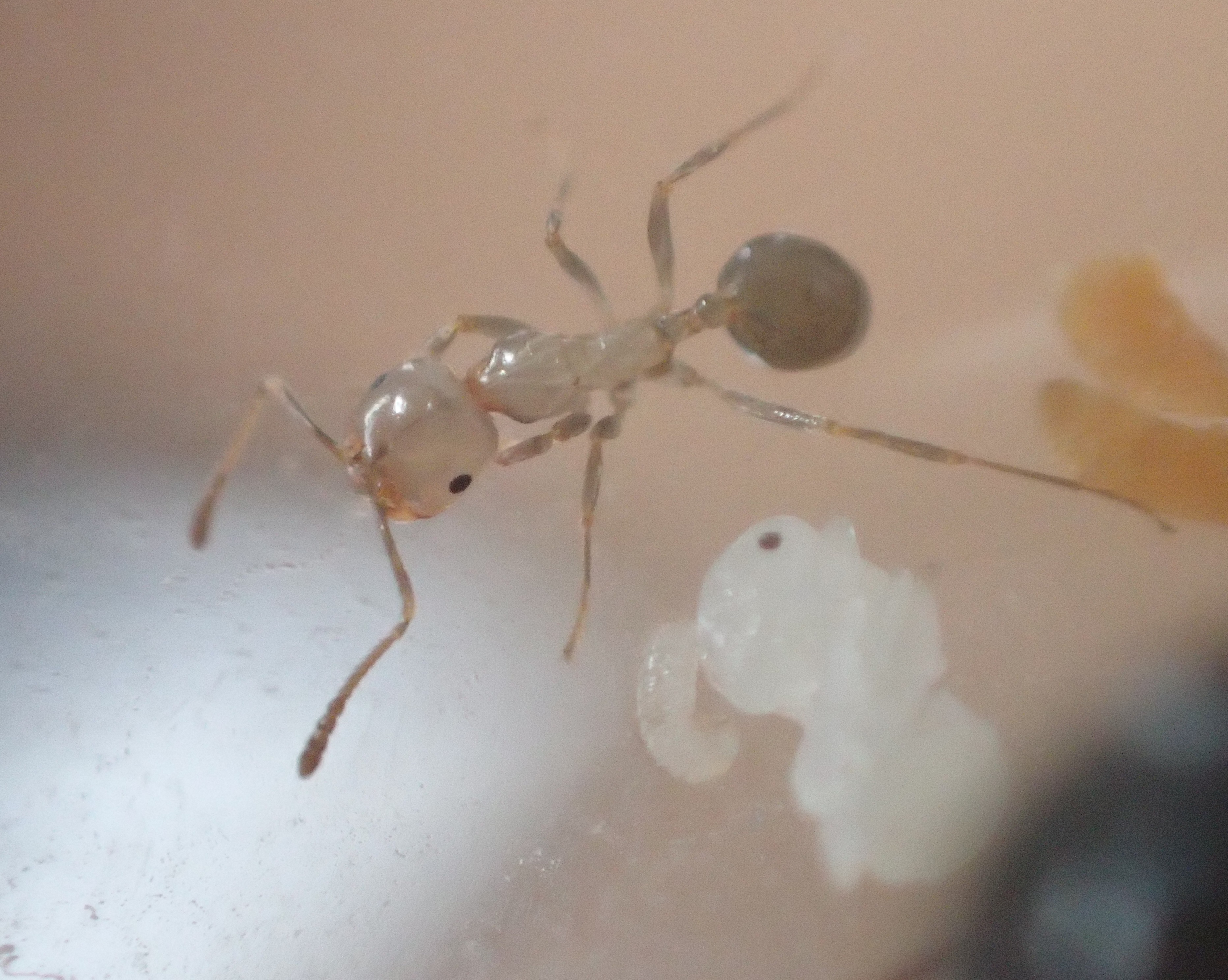 J'ai le plaisir d'annoncer la naissance de la première ouvrière aujourd'hui même, soit 51 jours après la ponte. Celle-ci, frêle et tenant à peine sur ses pattes, offre déjà le mésonoma décliné de rouge et noir assez caractéristique de l'espèce. Espérons que nombre de ses sœurs verront le jour dans les semaines à venir.