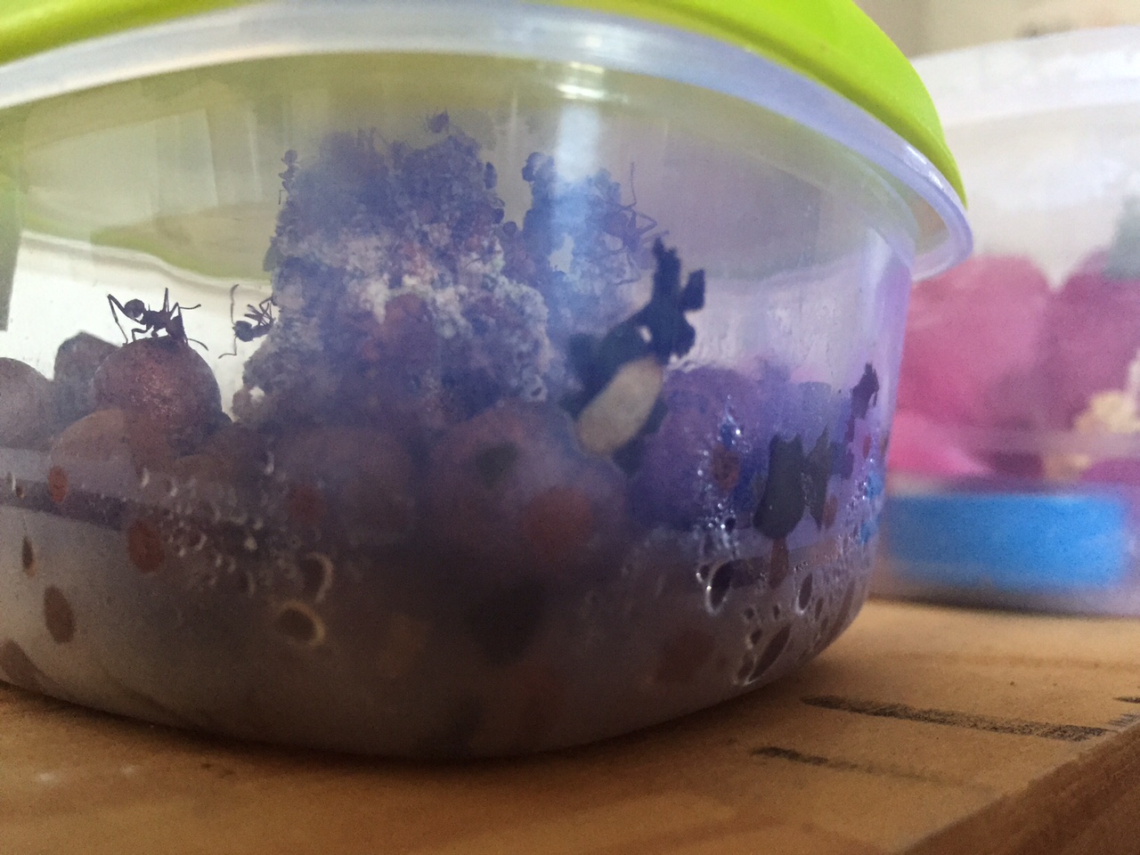 Aussitôt réceptionnées, j'ai intégré mes nouvelles pensionnaires dans leur nouvel antre : deux récipients en plastique, un pour le fungus et un autre pour l'aire de chasse (voir photo). Le fungus est déposé sur des billes d'argiles, un tuyau permet d'introduire de l'eau pour l'humidité.