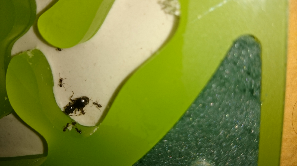 Nous sommes passés de 9-10 fourmis à 8 en comptant Bratisla. Le tube n'a malheureusement pas fait effet et les ouvrières ont décidé de rester dans leur chambre avec le couvain et La Reine. Donc, après ma décision, j'ai décidé de mettre le tube en espèce d'ADC.. Du coup toute la nourriture est stockée dedans et pour le moment c'est ce qui leur sert d'ADC. Je ne sais pas encore comment je vais faire pour nettoyer leur fourmilière mais mis à part démonter la fourmilière pour le faire, je réfléchis à d'autres manières de les enlever ? L'aspirateur à insectes peut-être ?