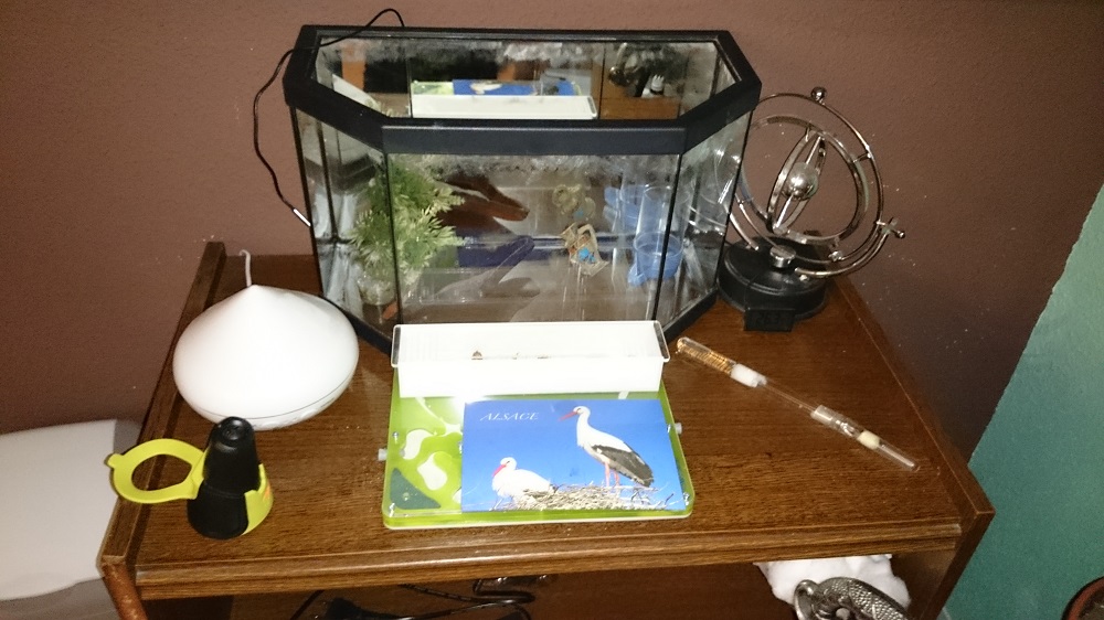 Ici, vous pouvez voir de loin mon aquarium. Comme vous le constatez j'ai mis du talc et pour le moment rassurez vous personne n'est encore entré dans l'ADC. La carte postale des cigognes cache Bratisla et Cie pour qu'elles soient dans la nuit en continue et puissent se développer tout étant nourrie... Sur la droite, vous voyez mon tube à essai qui englobe celui de Myrmecoco pour que Nasma et Cie puissent s'y développer doucement mais surement. Ensuite tout à gauche, le truc jaune c'est ma lampe torche qui me permet de regarder un peu et de façon plus claire ce que font ces damoiselles. Le gros truc blanc c'est mon diffuseur de chambre qui n'est pour le moment pas allumé mais je pense pouvoir y remédier dans quelques temps. Le truc à droite de l'aquarium c'est un souvenir du Futuroscope car mon chéri et moi-même sommes passionnés de l'univers et de l'espace. A droite, la chose ou le fil qui pendouile c'est la sonde de mon thermomètre qui indique en ce moment même 26.2 °C