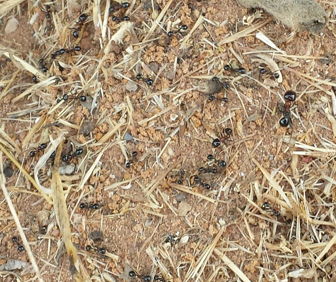 Elles sont de couleurs noires, avec un thorax couleur brique. Elles sont polymorphes : j'ai dénombré au moins 3 tailles différentes. La major fait 1cm environ. Le nid est un trou dans la terre, précédé d'un dôme fait de sable/terre et de brindilles. Elles semblent principalement actives quand l'air se rafraichit, en fin d'après-midi.