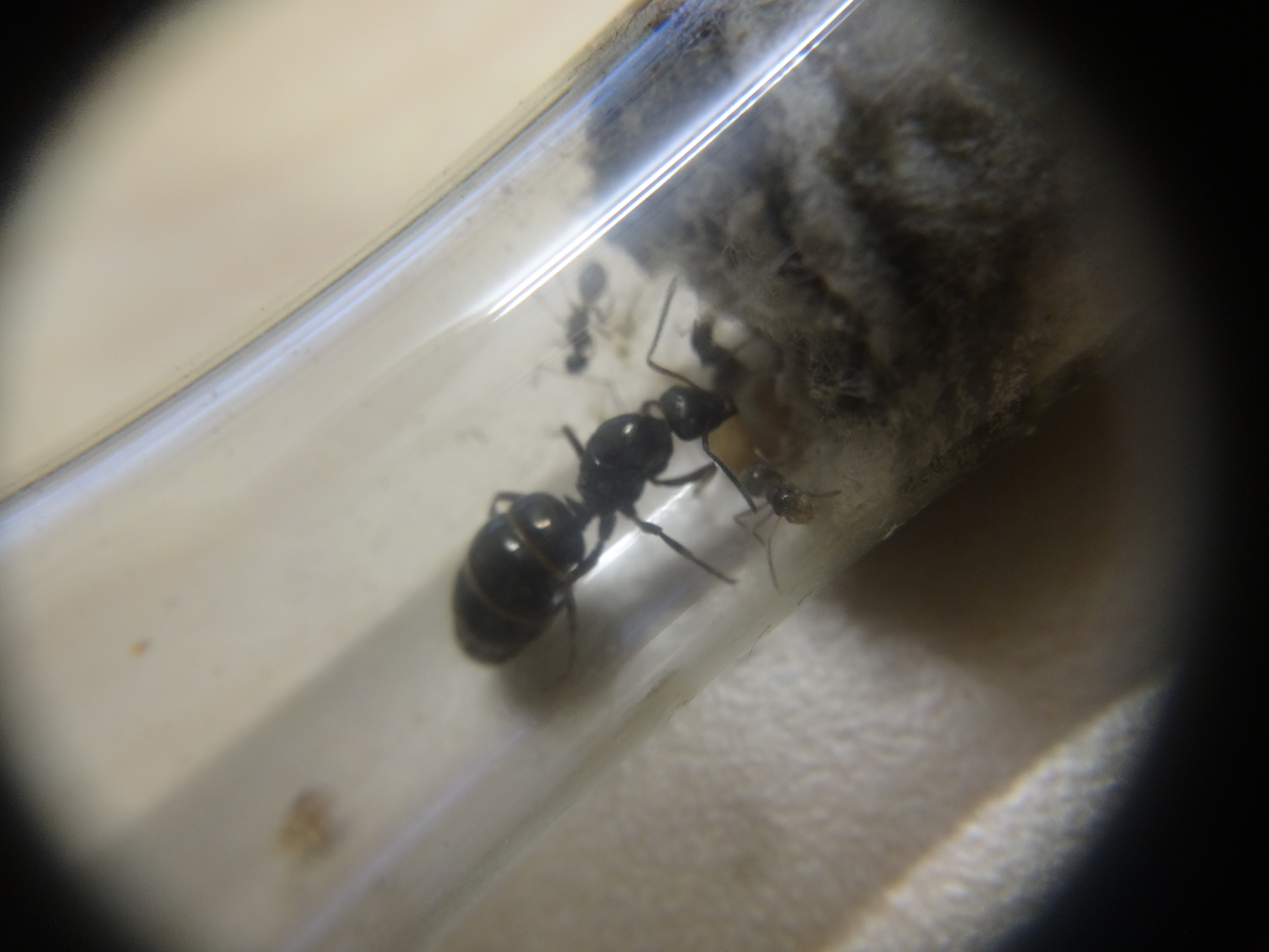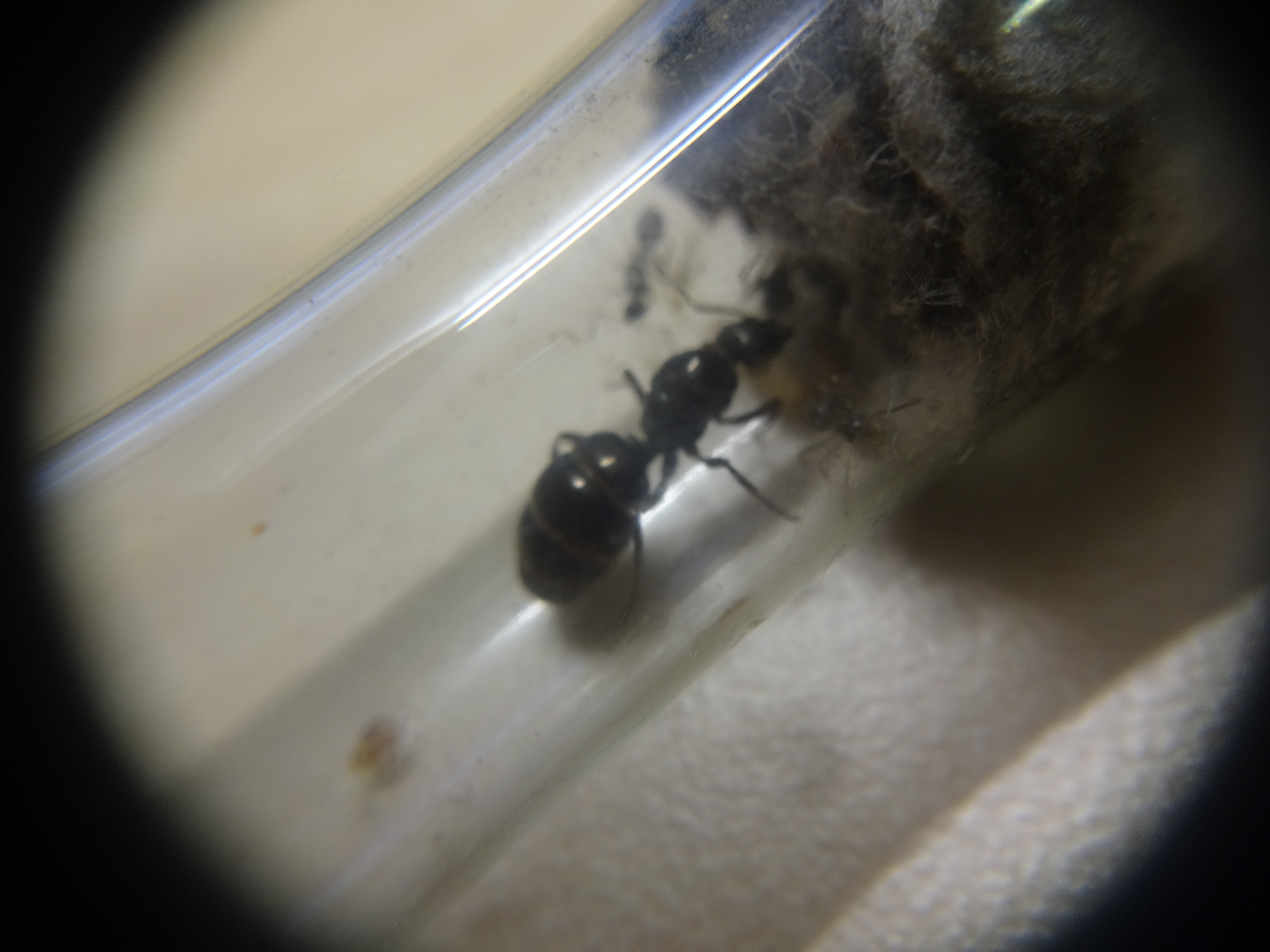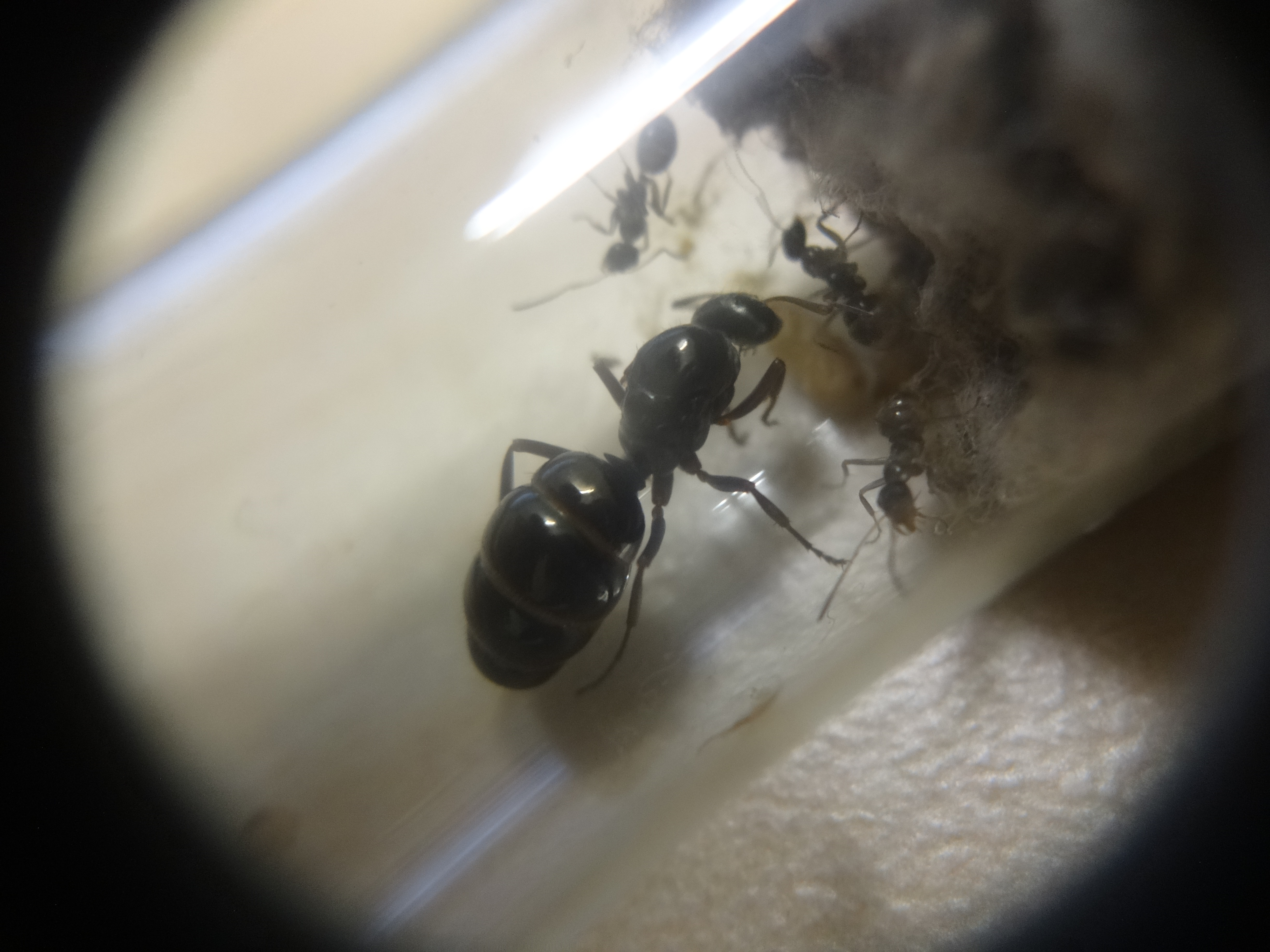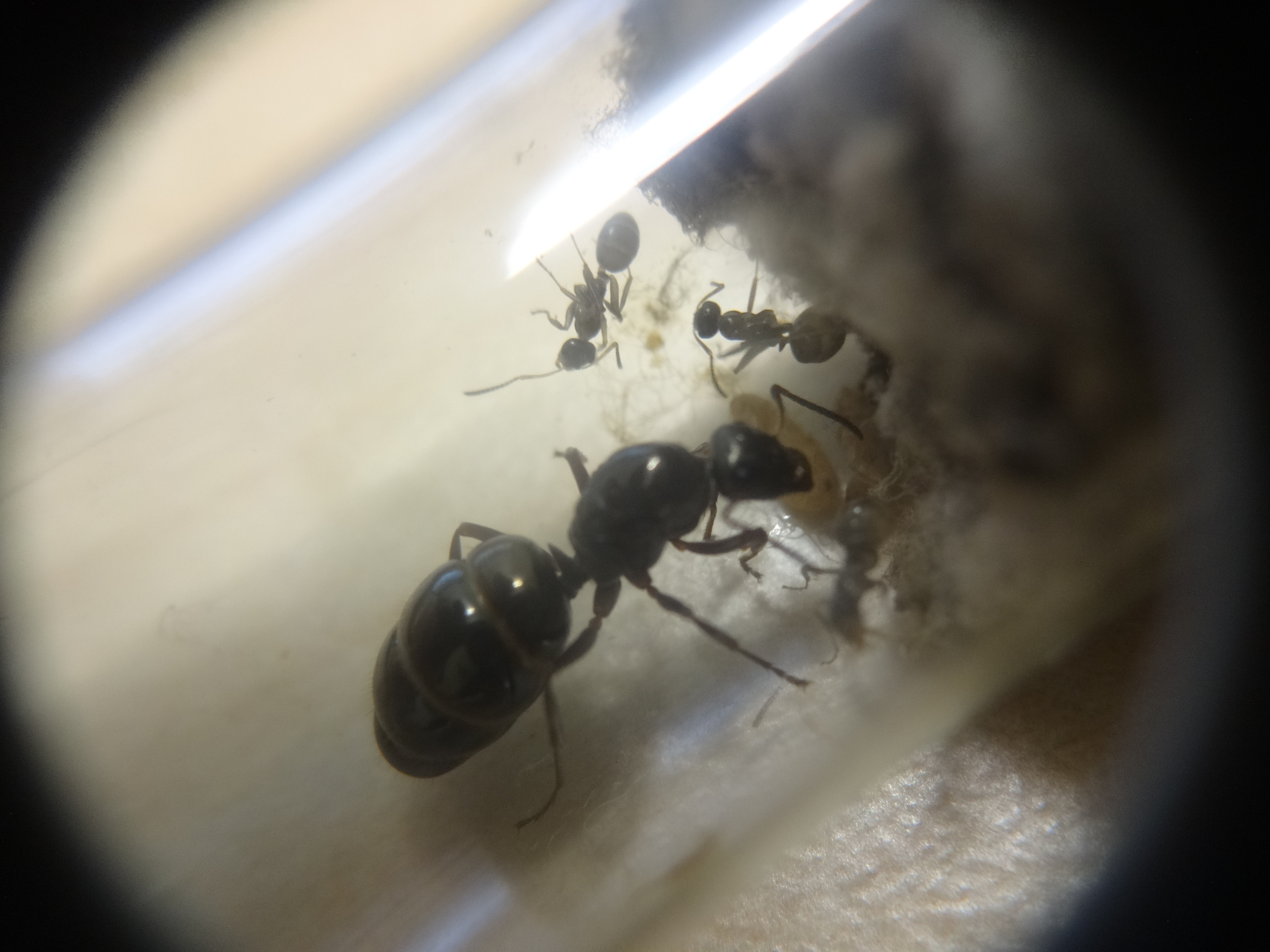Petite précision, elle mesure environ 15 mm (à la louche), et elle a eu ses premières ouvrières hier, soit plus d'un mois et demi après sa première ponte...