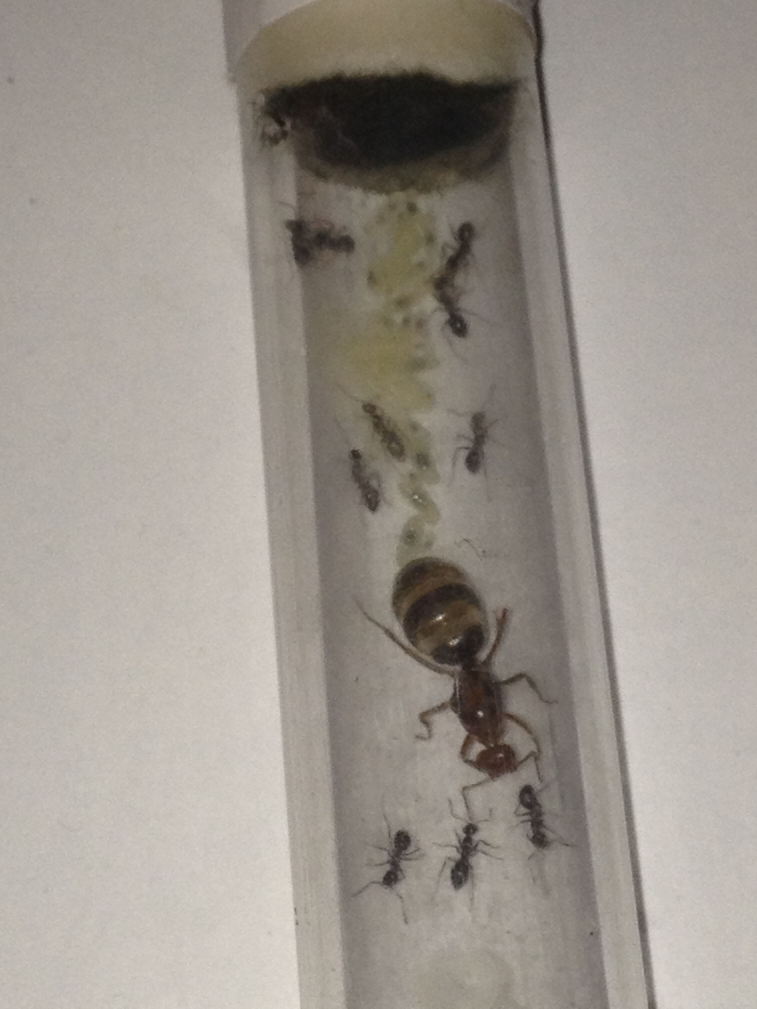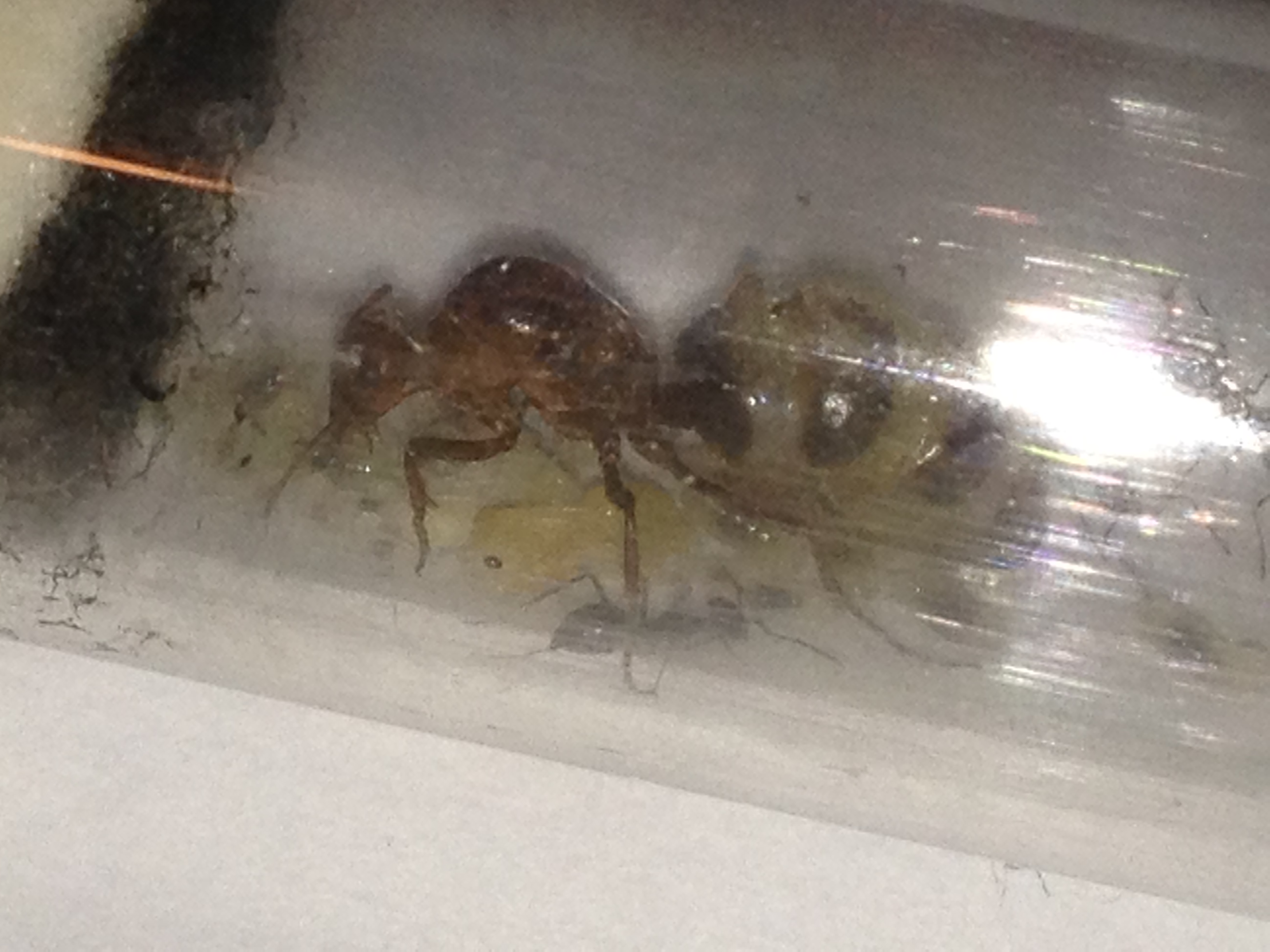 Dès son arrivée, la gyne s'est mise à stocker beaucoup de pseudo miellat et à se doter d'une physogastrie impressionnante, qui rappelle que même si ce rôle n'est pas alloué aux gynes, cette espèce reste une fourmi "pot de miel".