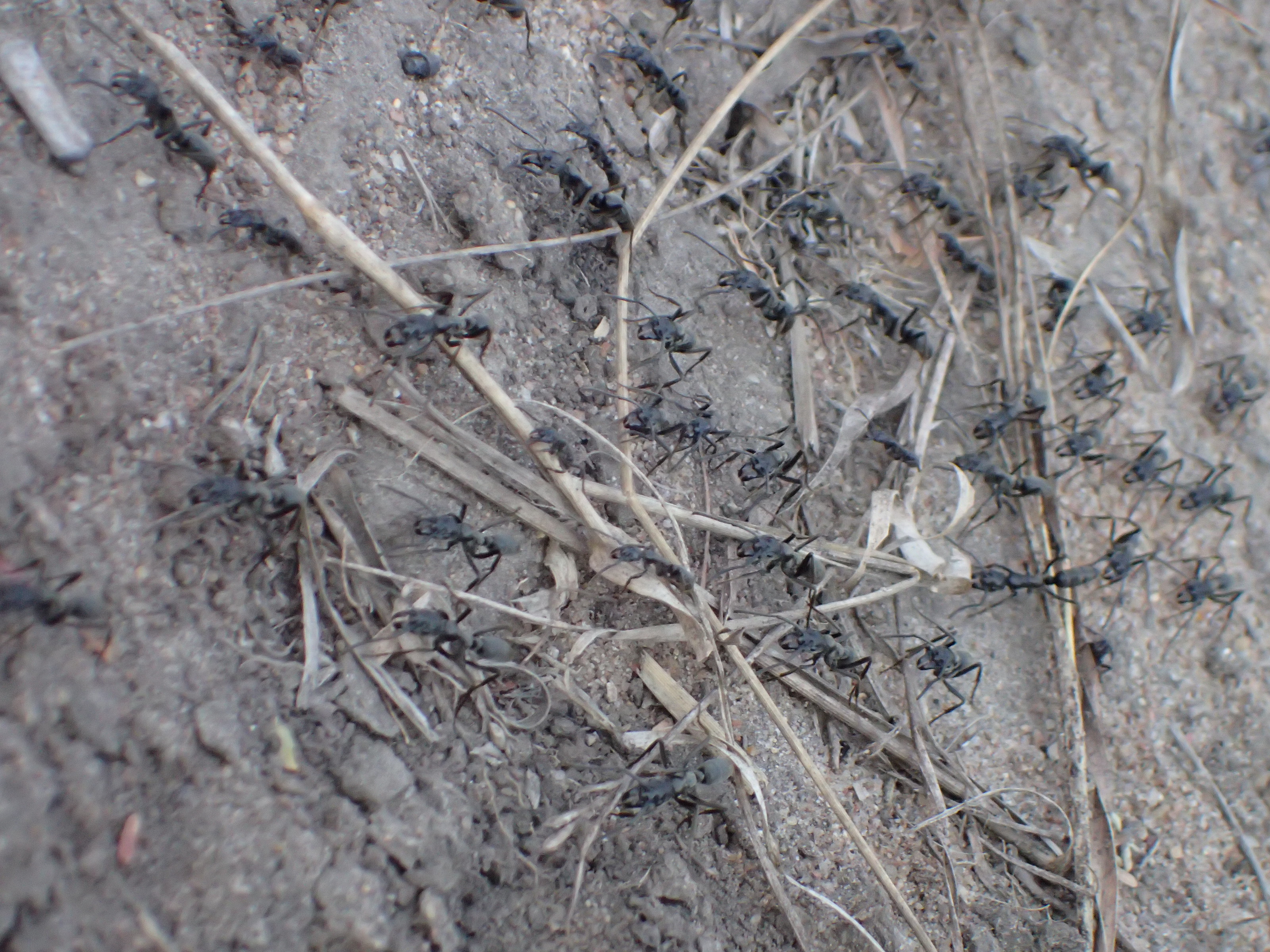 Cependant, point de lions ni d'éléphants en vue, mais de très nombreuses Camponotus sp. du groupe maculatus occupent la jonction entre terre et bois mort sous le soleil de plombs des mers d'herbes sèches. Quelques nids de Myrmicaria sp. peuvent être trouvés à l'ombre de bosquets, ça et la. Et surtout d’impressionnant raids de Pachy... heu, Megaponera, peuvent s'observer. Surnommées localement les "matabele ants", ces Ponerinae purement termitivores lancent de brutaux et féroces assauts sur les termitières du coins, toutes mandibules dehors. Il est au passages et selon la coutume indigène, fortement déconseillé d'essayer d'interrompre un raid du pied. Une piqûre serait, paraîtrait-il, la meilleure manière de vous faire réviser les injures les plus outrageuses que vous connaîtriez dans toutes les langues. Cet état de fait se vérifia de temps à autres par de distants cris gutturaux de surprise et de colère audibles dans le lointain, tels une ode douce et mélancolique au travail du myrmécologue moderne.