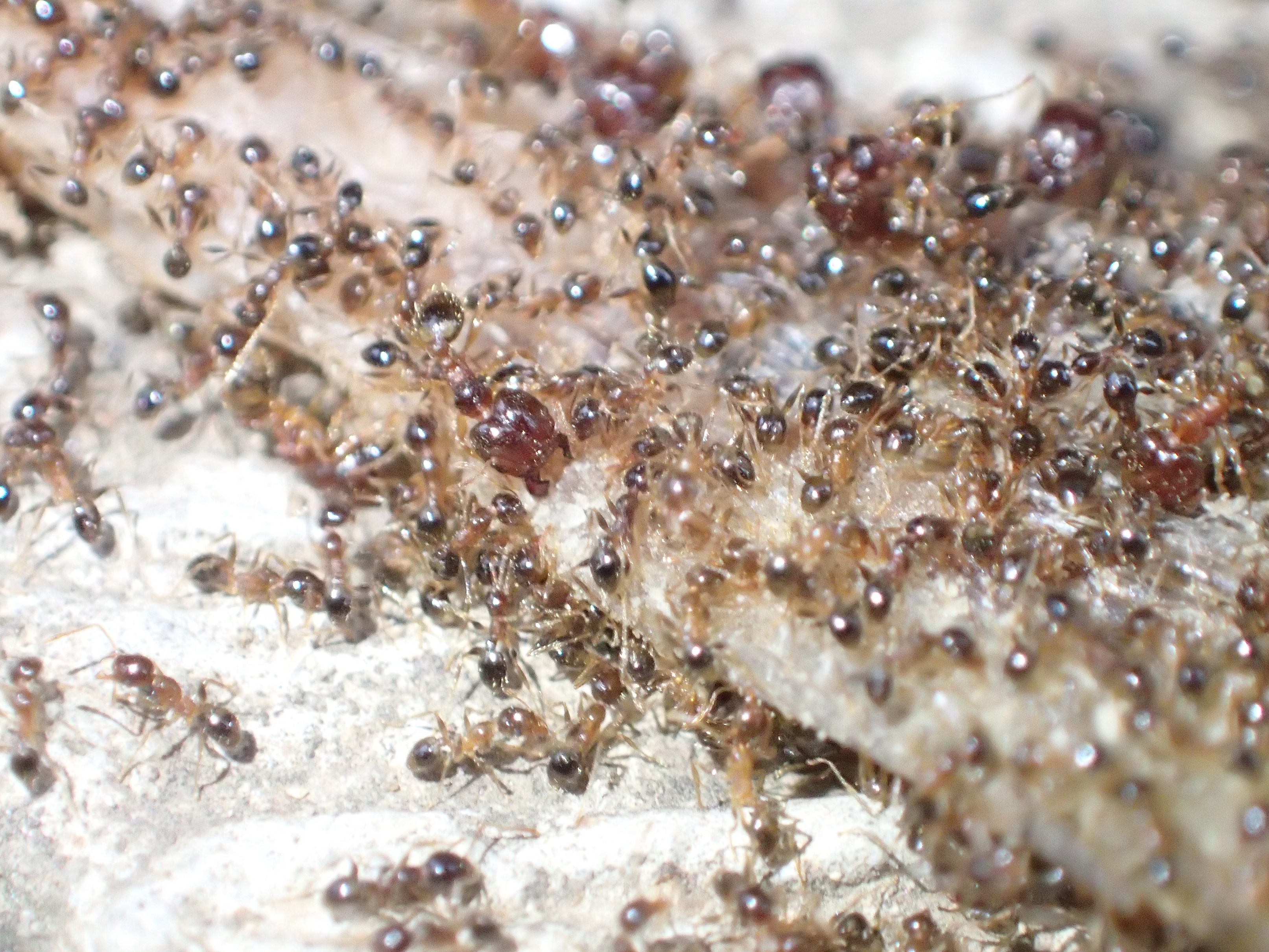 La myrmécofaune d'Afrique du sud est n'a rien de comparable avec celle que l'on a tant l'habitude de côtoyer. Je commencerai par dire que les espèces de Pheidole du groupe megacephala sont peut-être parmi les espèces les plus dominantes du parc, tous biotopes confondus. Littéralement partout de la station à la forêt vierge, elles grouillent, n'hésitant pas à se jeter sur la moindre miette de nourriture ni a s'engager en pugilats féroces avec les colonies voisines. On n'y retrouve également quelques Pheidole sympathiques d'autres groupes, comme ces Pheidole liengmei dont les major atteignent des tailles respectables frôlant le centimètre.