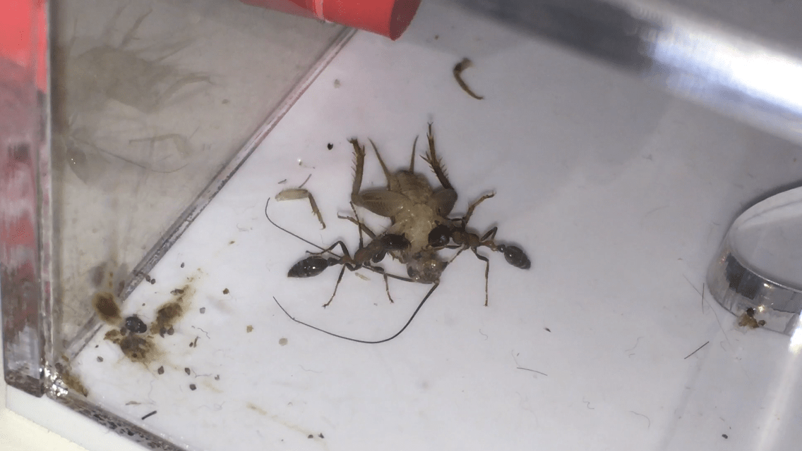 Ajouté à ce miellat, je leur donne un grillon frais tout les jours. Tout comme les asticots qu'elles tuaient puis laissaient de coté, elles ne s’intéressaient pas plus que ça aux grillons. Toute cette semaine, j'ai donc pris la peine de couper un grillon en deux (après l'avoir tué), et seulement là, elles daignaient en gouter un peu. Jusqu'à ce matin où j'ai à nouveau déposé un grillon simplement assommé qui fut immediatement pris d’assaut par d'abord une ouvrière puis les cinq, la première étant rapidement retourné au nid chercher ses sœurs, faisant ainsi une démonstration de leur grande capacité de recrutement. Il est d'ailleurs assez marrant d'observer lorsque j'interviens dans l'adc vide de fourmi, à quelle vitesse une ouvrière arrive dès que ma présence est détectée (fichu caractère les gamines :hihi: ).