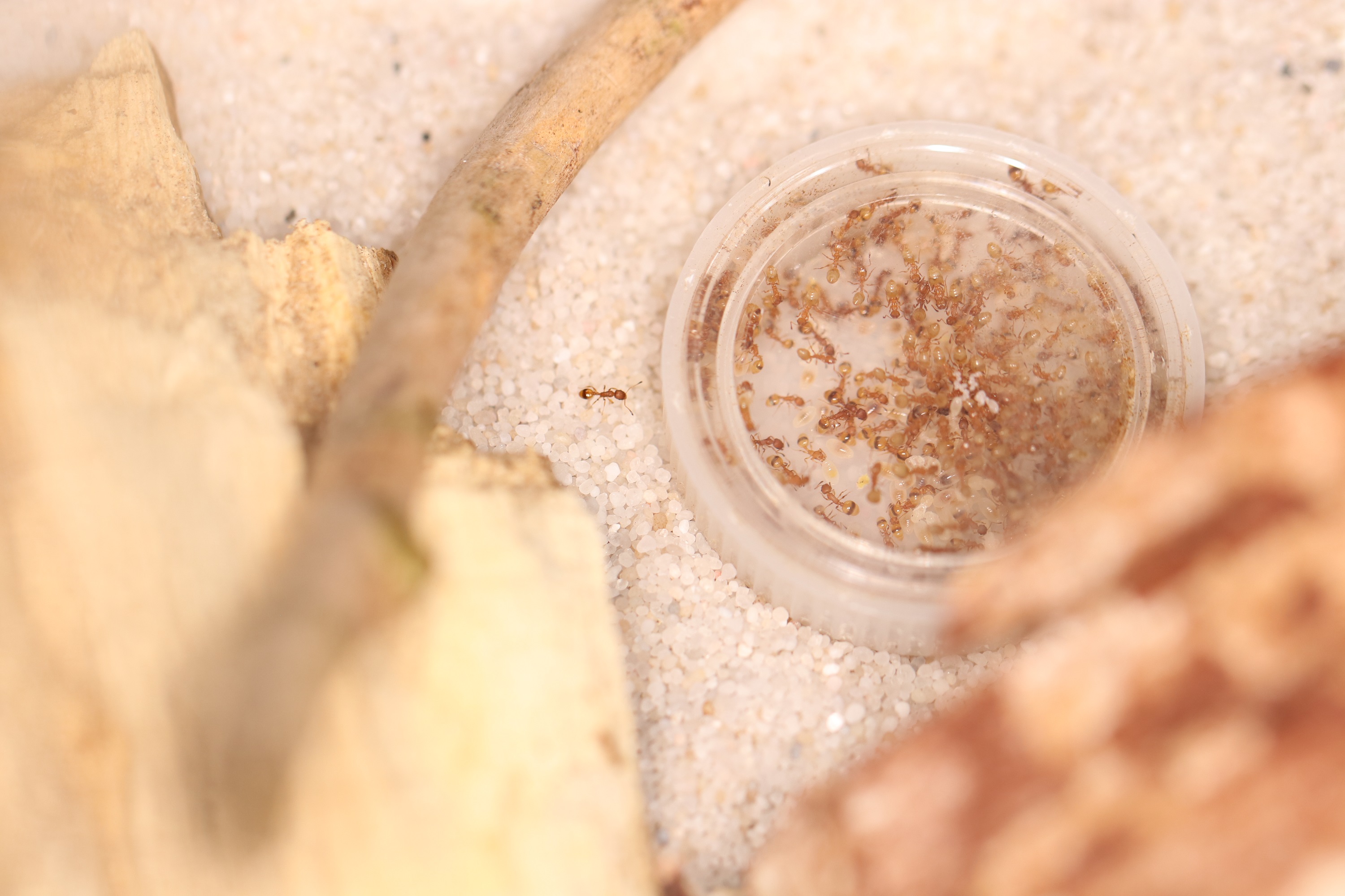 - des liquides sucrés (sirop d'érable, d'agave, différents miels, tous dilués) et des insectes séchés tous les 3-4 jours, mais le nourrissage est une vraie galère car elles deviennent surexcitées dès qu'on retire le couvercle.
