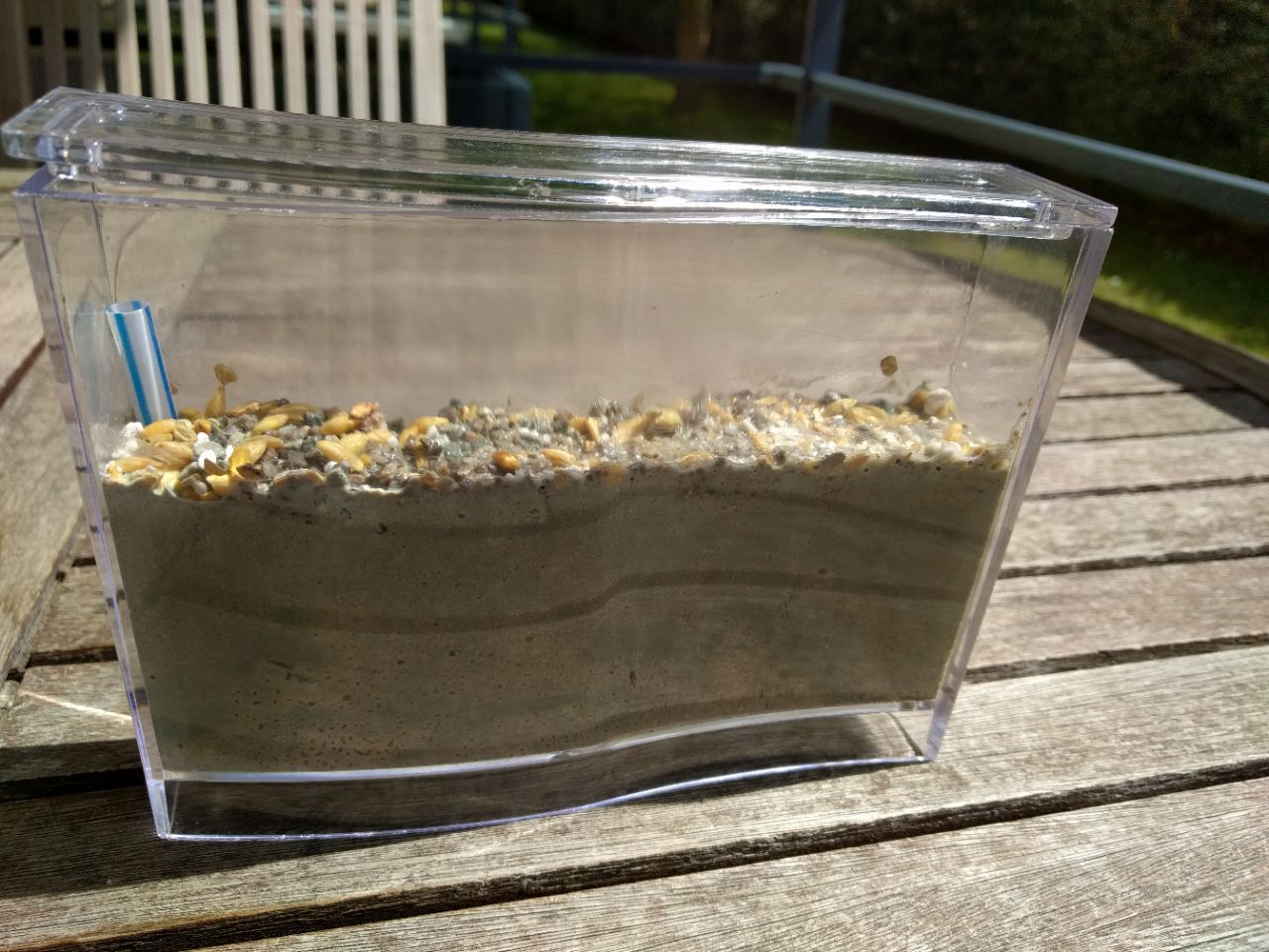 Je lui ai fait un nid douillet à base de mélange sable argile avec des graines d'herbe à chat sur le dessus.
