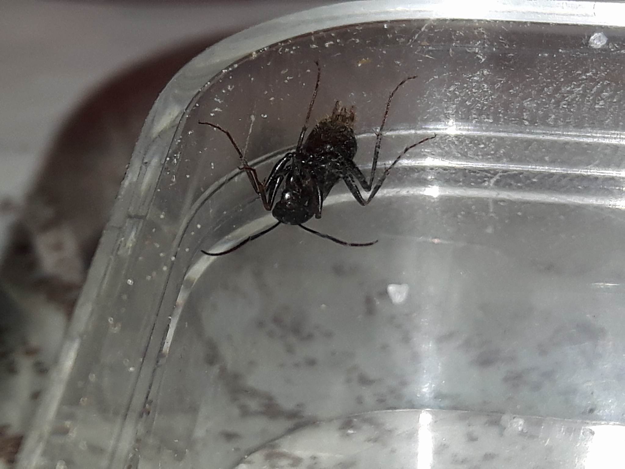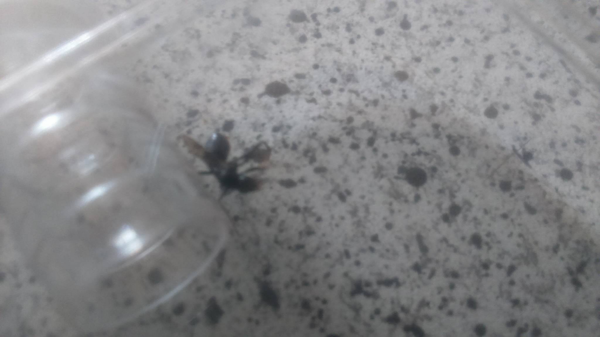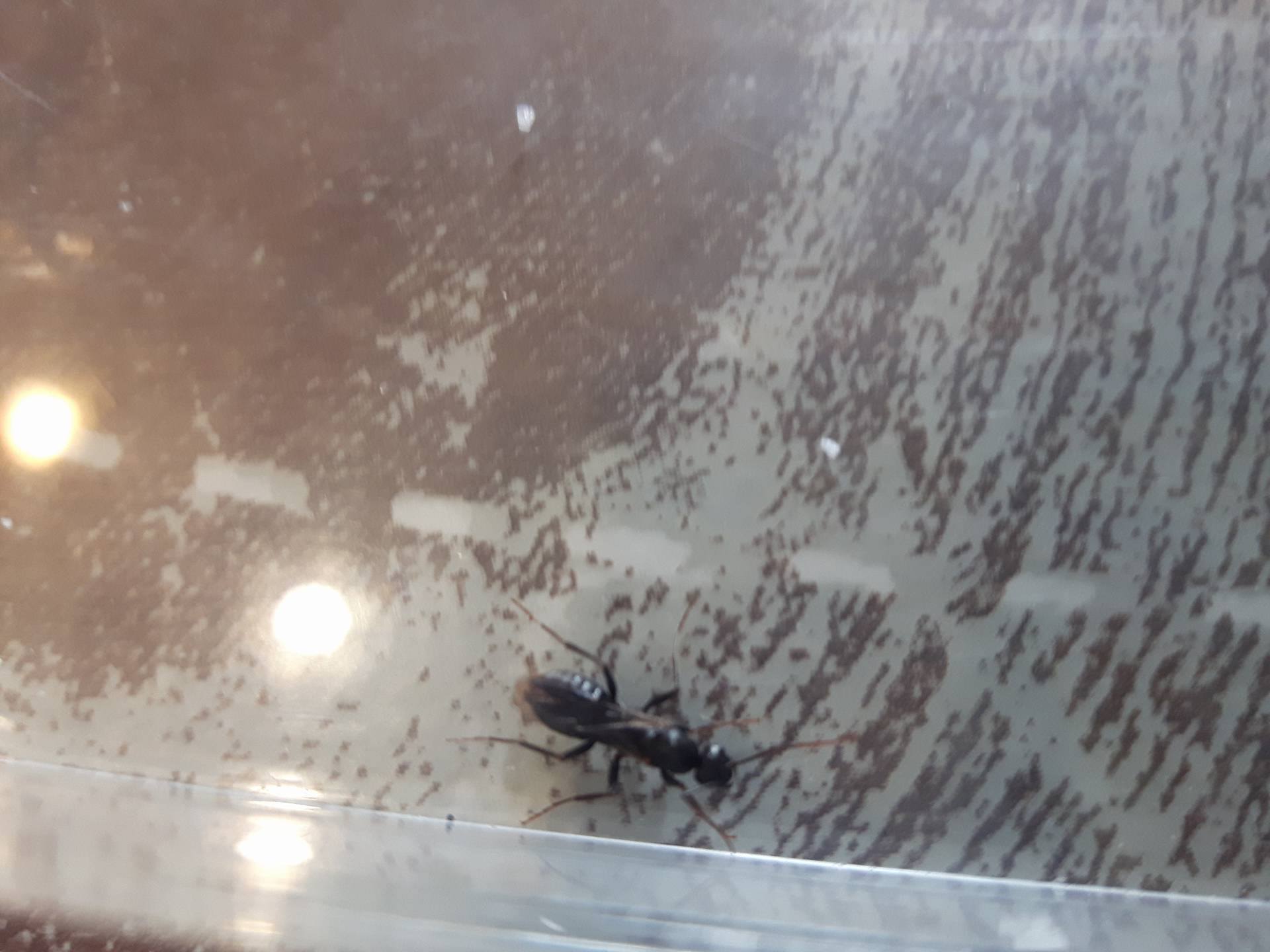 Hey salut tout le monde. J'ai trouvé une fourmi devant chez moi à Rivesaltes, dans la rue sur le trottoir, elle mesure légèrement plus d'1 cm et est de couleur noire, les pattes sont noires et le bout est orangé. Elle a de petites ailes de la taille de son corps ou un peu plus petites, on dirait qu'elle a un dard, son cul est rayé de noir et de marron (un peu plus sombre que la couleur de ses pattes), avec des petits poils jaunes. Elle est assez rapide et j'ai noté qu'elle préfère aller dans la partie aire de chasse que dans la partie tube.