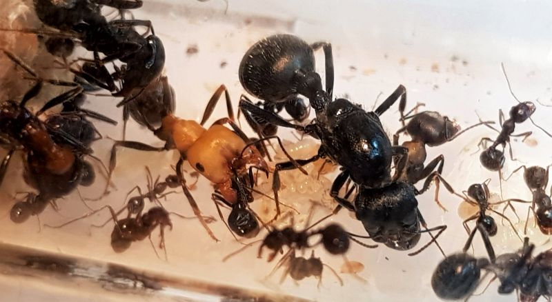 J'ai reçu la colonie le 3 août dans un tube de 20 mm sur 200 dont la réserve d'eau avait été vidée pour le transport, elle comptait une grosse soixante d'individus, aucune perte lors du transport. J'ai eu 6 décès le lendemain 3 petites ouvrières, 2 minor un peu plus grosse et un petit media, depuis aucun décès à signaler.